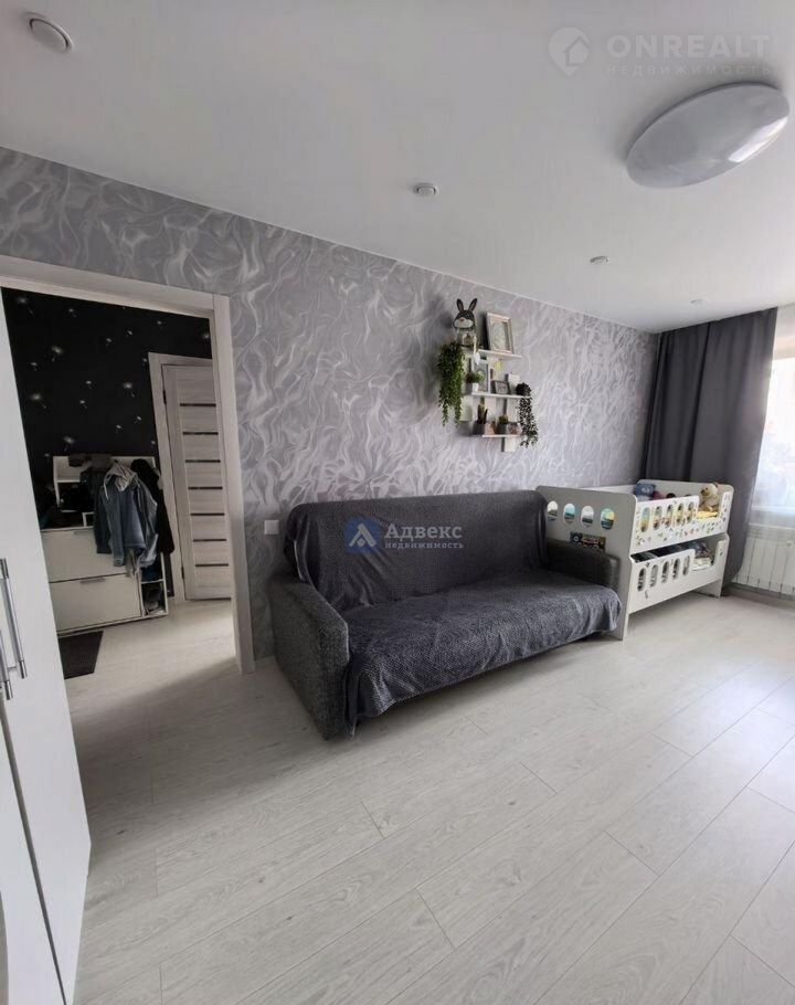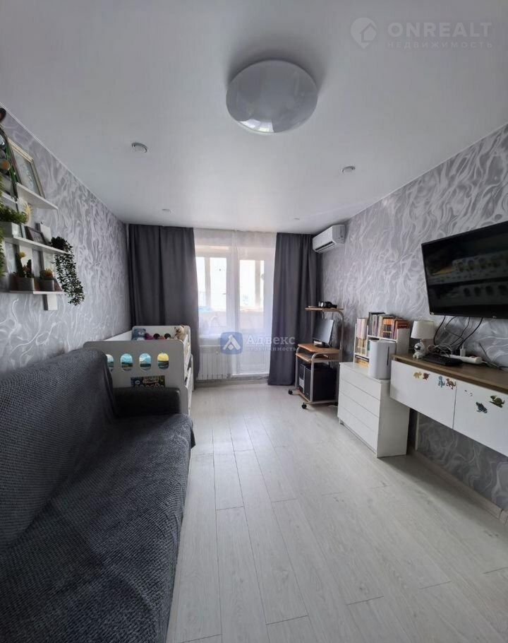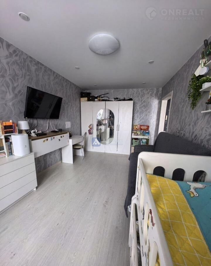 В комнате при продаже остается вместительный шкаф. настенная полка, шторы блэкаут и тюль.
