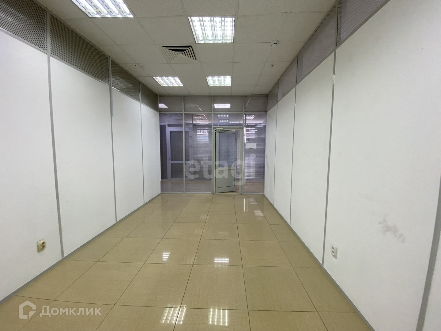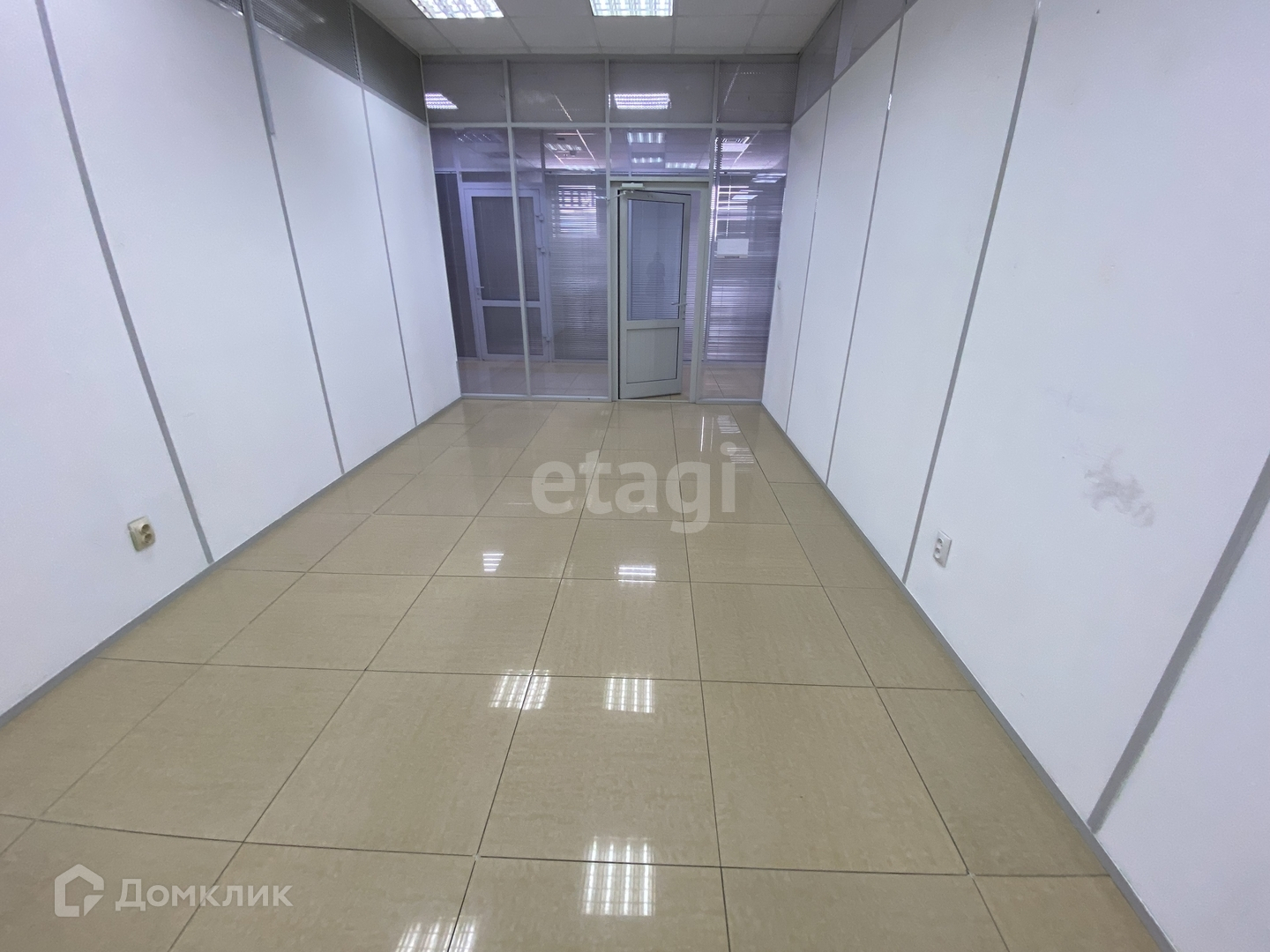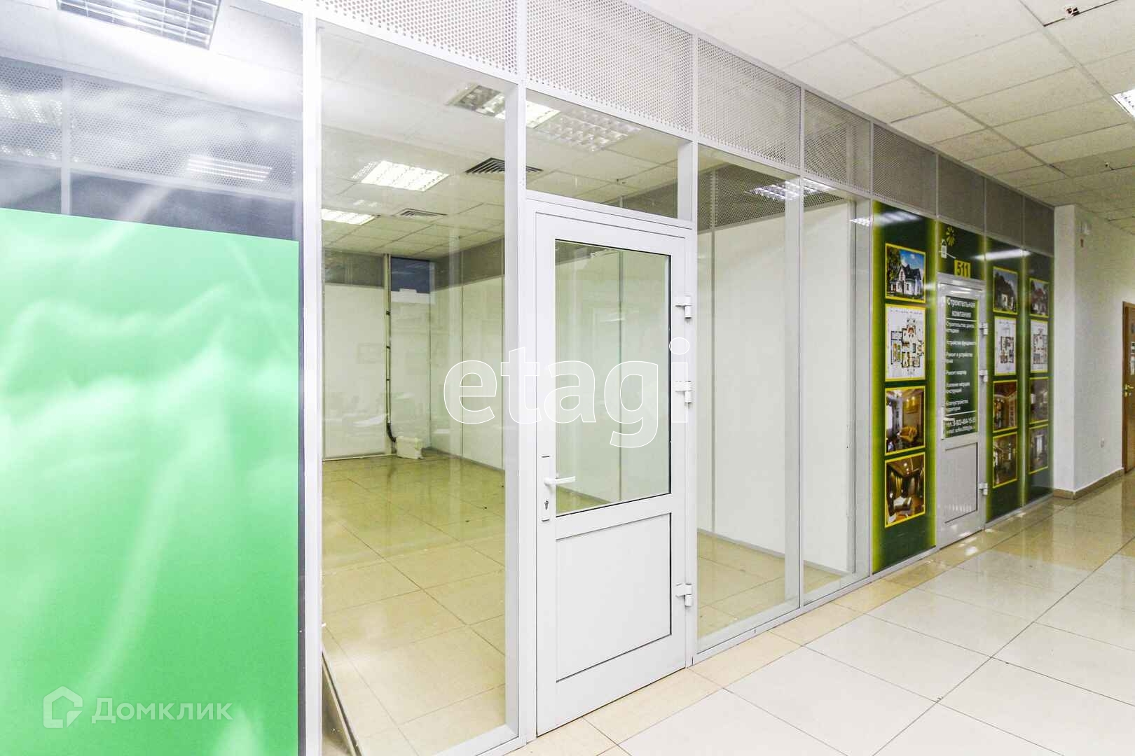 на стенах пластиковые панели, потолок подвесной. Двери в помещении стеклянные. Рядом