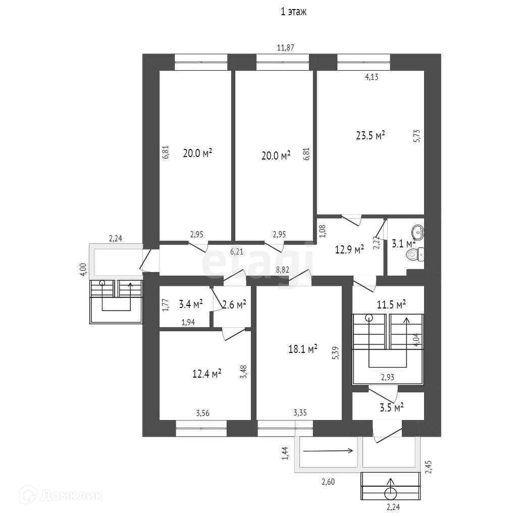 1 этаж состоит из 4-х офисов: 18 м2, 20 м2, 20 м2 и 24 м2, коридора и сан.узла.