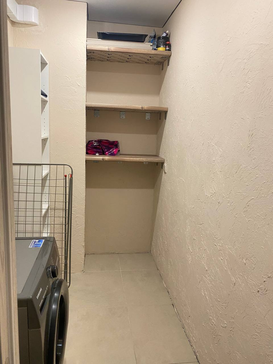 В прачке машинка стиральная, стеллаж для полотенец, 3 полки для баночек, химии и тд