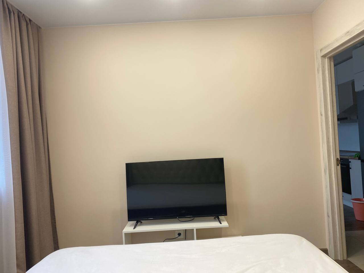 В спальной комнате остается кровать (200*220 с ортопедическим матрасом), шкаф для одежды, небольшая тумба с телевизором, две прикроватные тумбы