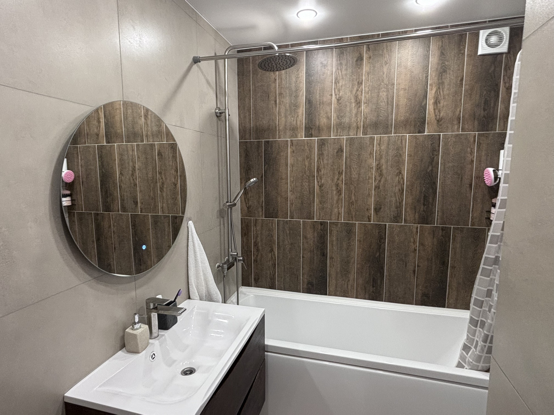 В ванной инсталляция, раковина подвесная с тумбой, зеркало с подстветкой, ванна 180см и тропический душ
