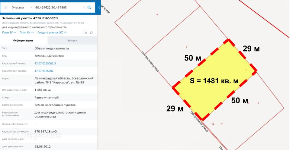 •  Участок  правильной формы, с деревьями, площадью 1481 кв. м