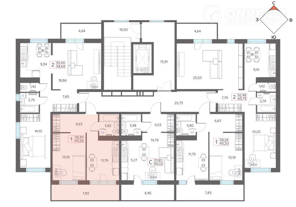 Общая площадь 43.3 м2