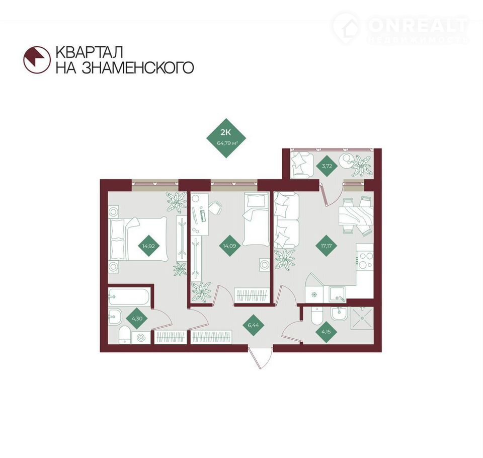 В «Квартале на Знаменского» нет студий — только просторные планировки с продуманными метрами, высокими потолками, семейные квартиры с просторными кухнями-гостиными, мастер-спальни с санузлами и гардеробными, светлые комнаты с увеличенными окнами и лоджиями с панорамным остеклением с видами лесной массив- можно выбрать из 12 уникальных планировок от 43,25 кв.м до 98 кв.м. Дом начинается с подъезда – современные стильные холлы как продолжение вашей квартиры. Для хранения сезонных вещей в цокольном этаже дома предусмотрены кладовые.