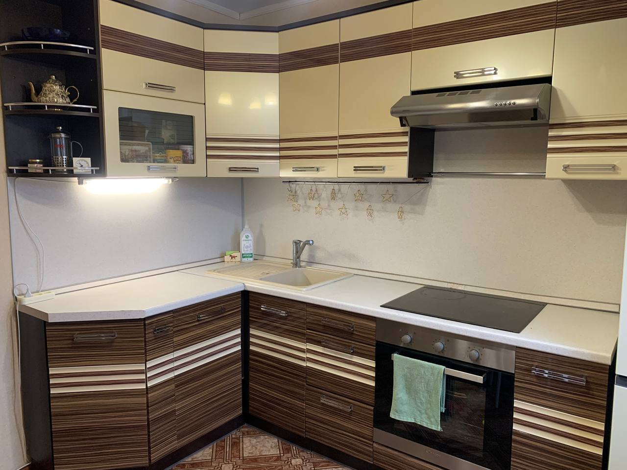 * кухонный гарнитур со встроенной бытовой техникой: варочная панель, духовой шкаф, посудомойка,