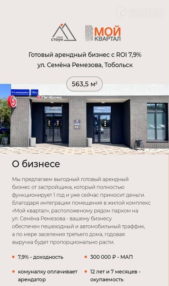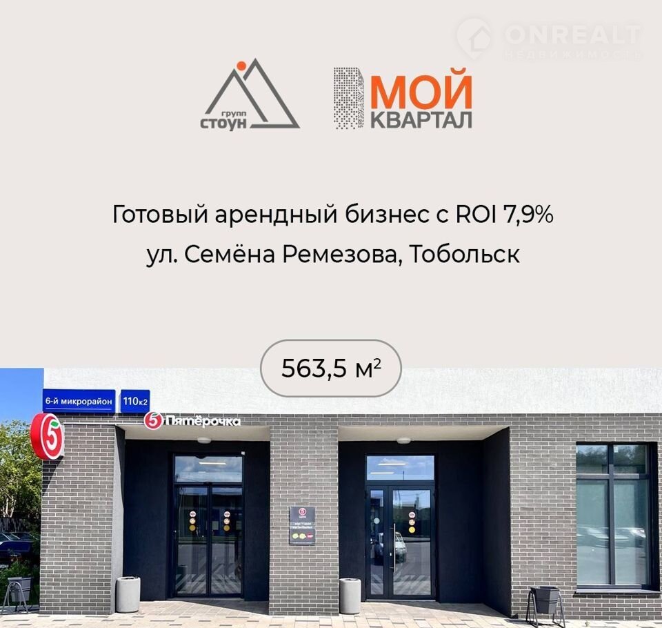 Готoвый aрендный бизнeс 563,5 м² c RОI 7,9% в ЖК «Мой квaртaл» на ул. С.Pемeзoва, Тoбoльcк.