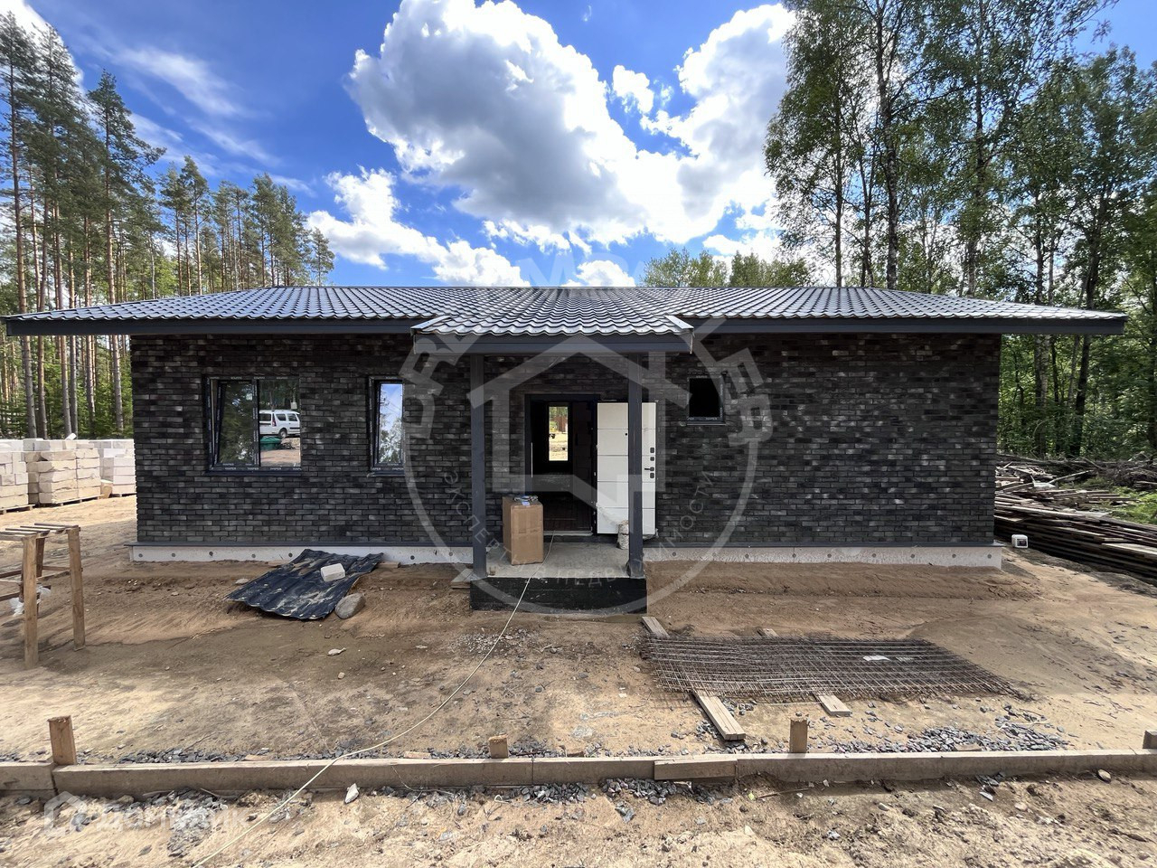 установка окон и входная дверь фасад, стены , теплый водяной пол (залит стяжкой), выполнен ввод в дом электричества и вода , установлен локальный септик