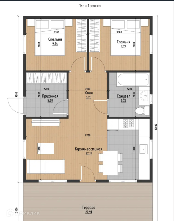Площадь кухни-гостиной: 23 м2