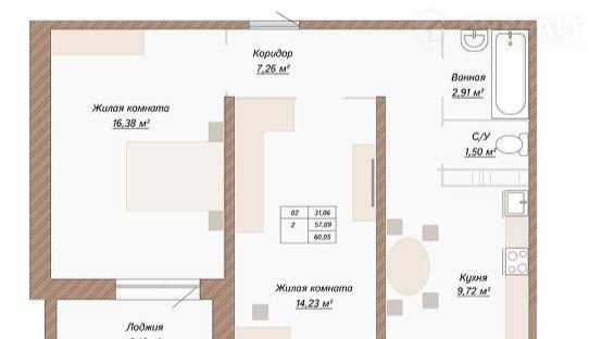 Общая площадь 60.1 м2