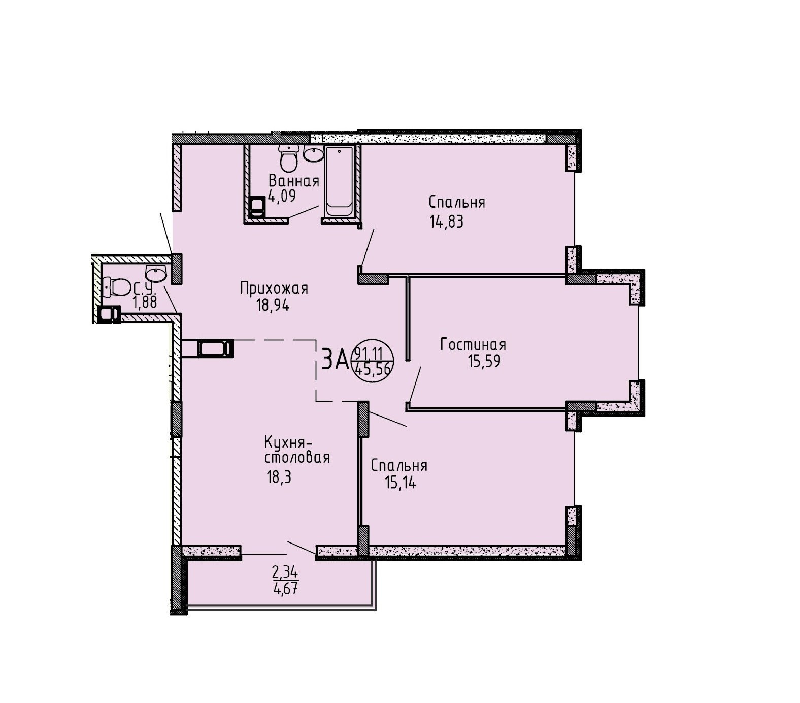 Общая площадь 91.11 м2