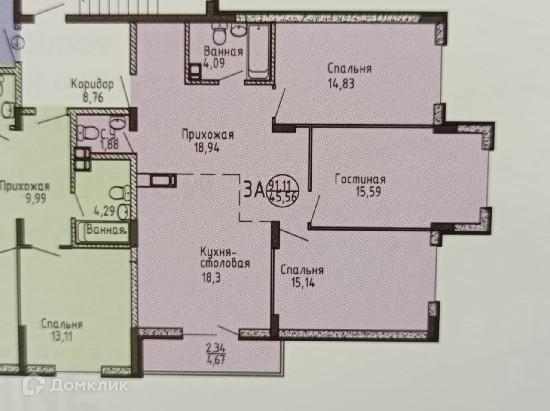Жилая площадь 45.5 м2