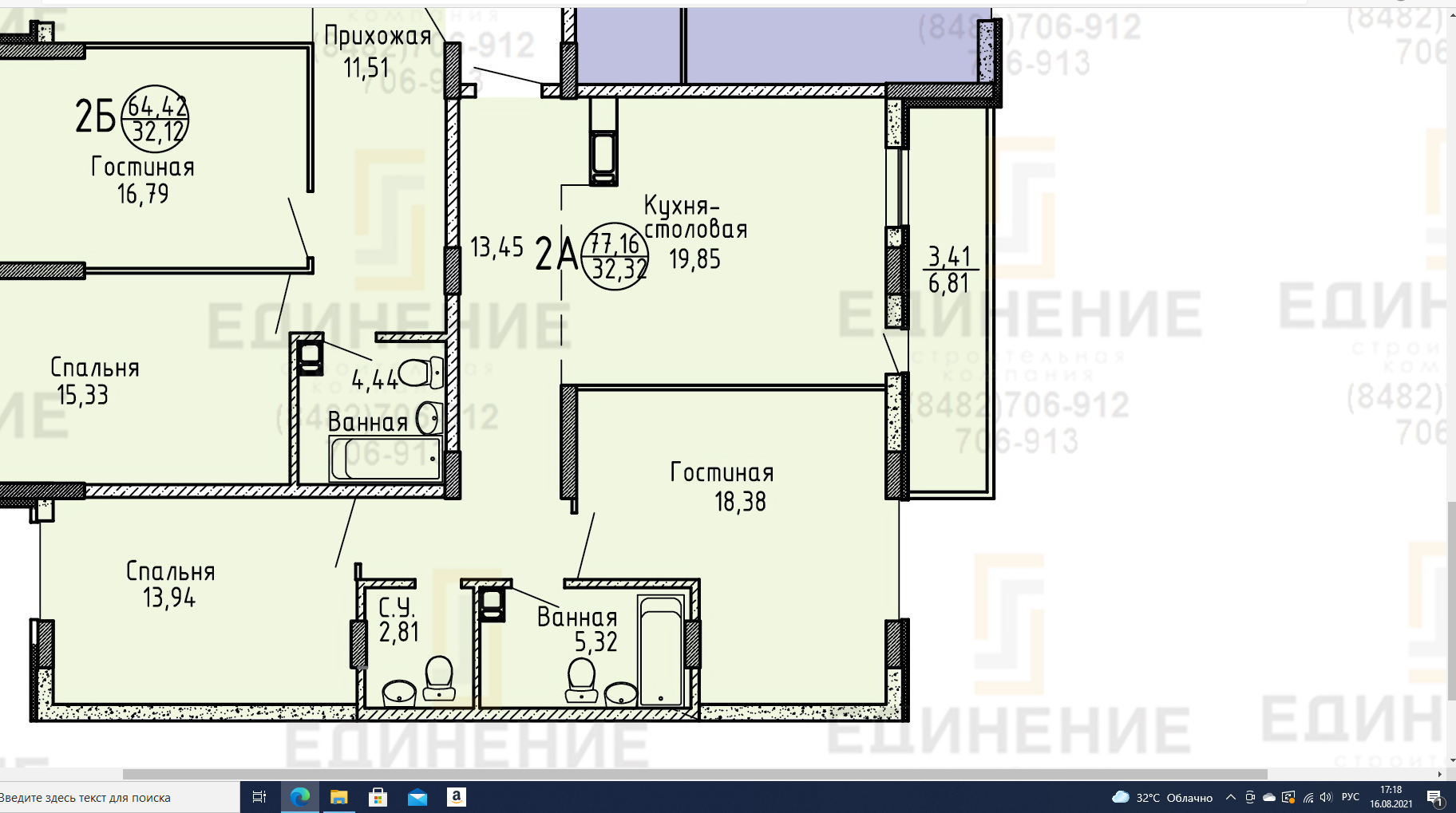 Общая площадь квартиры 77,16 кв.м.