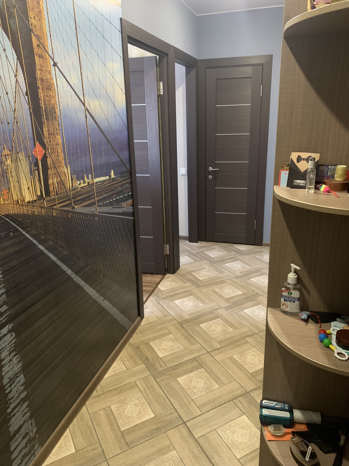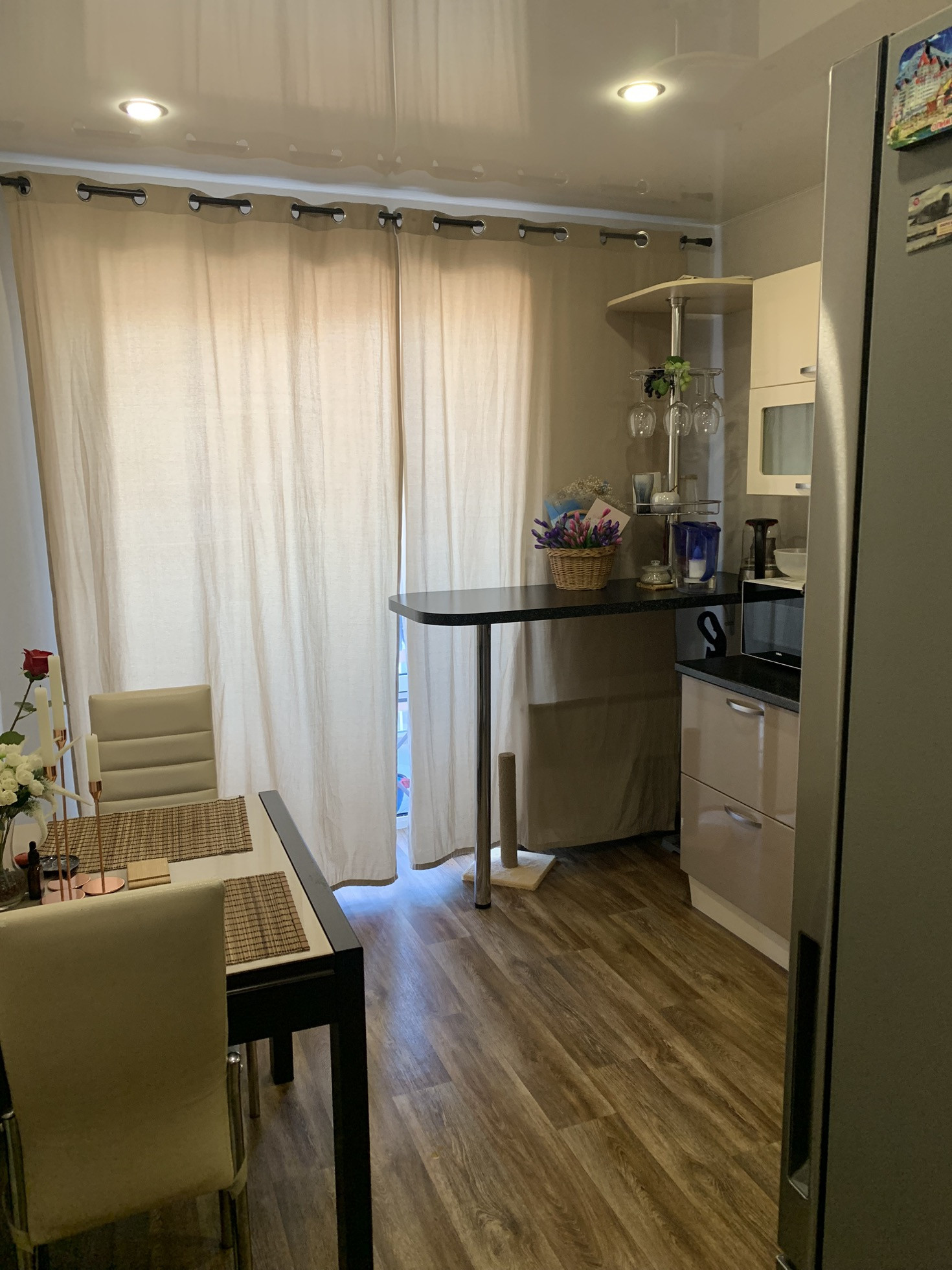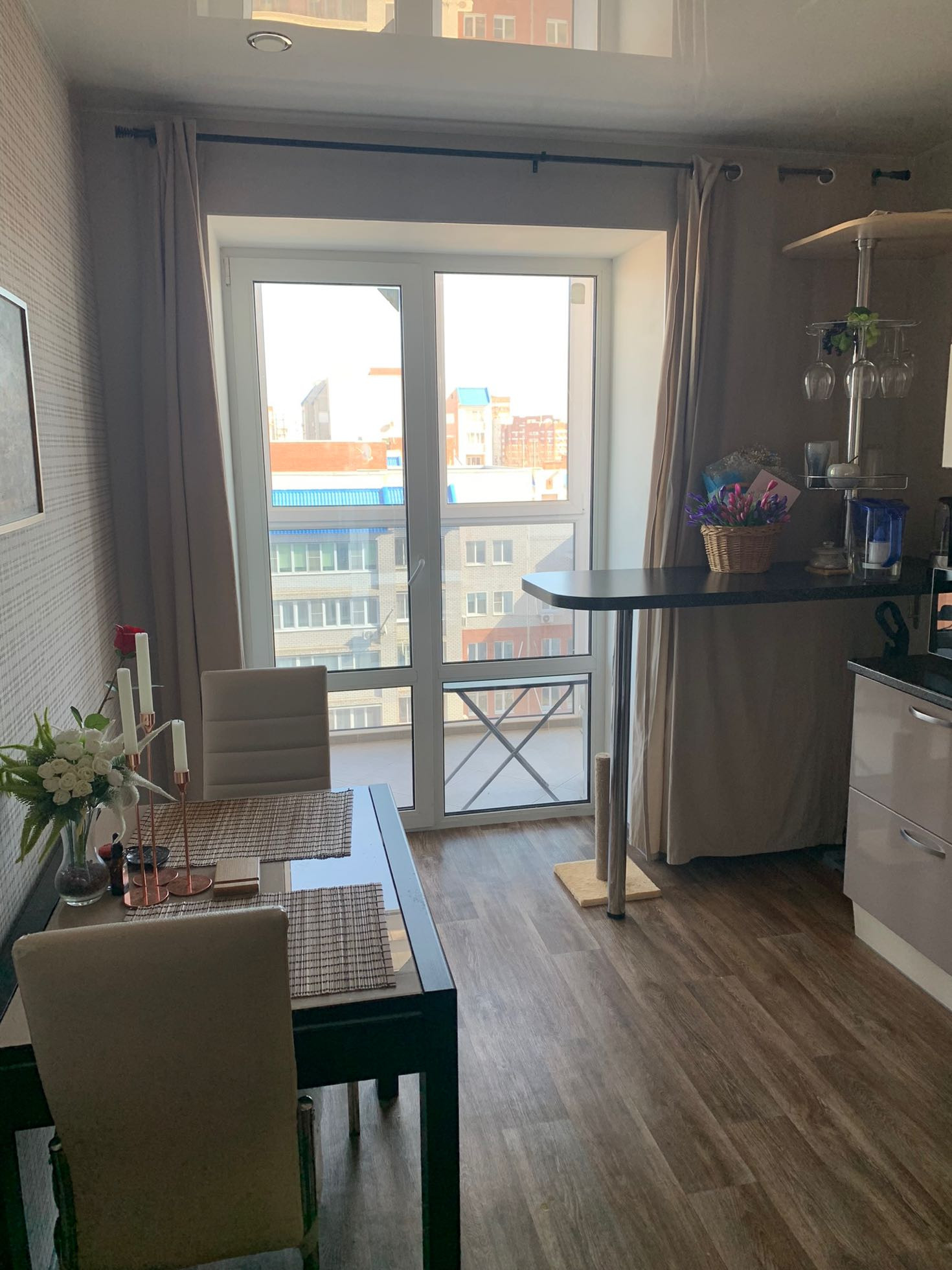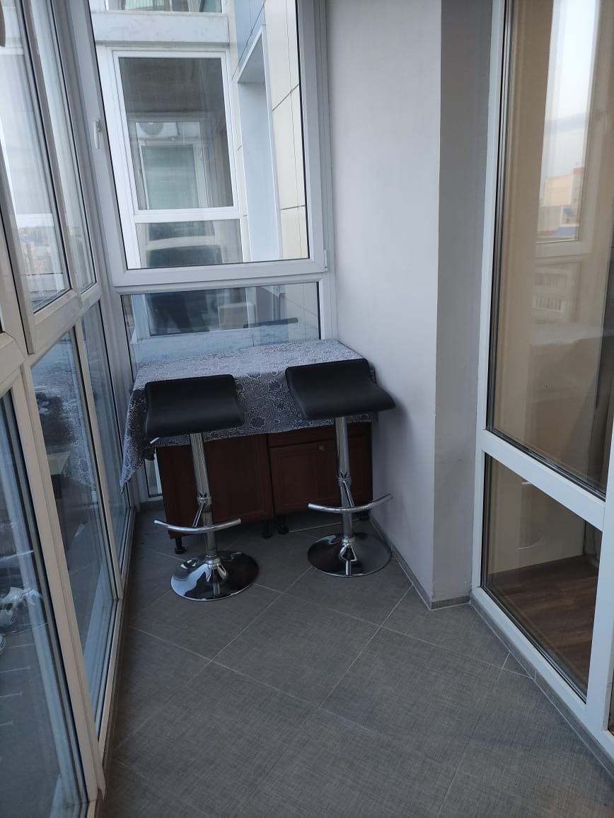 В квартире остаётся кухонный гарнитур (варочная панель, духовой шкаф, вытяжка) ,барная стойка со стульями, кондиционер Haier, большой встроенный шкаф-купе в коридоре. На кухне панорамные окна, отделанный балкон.