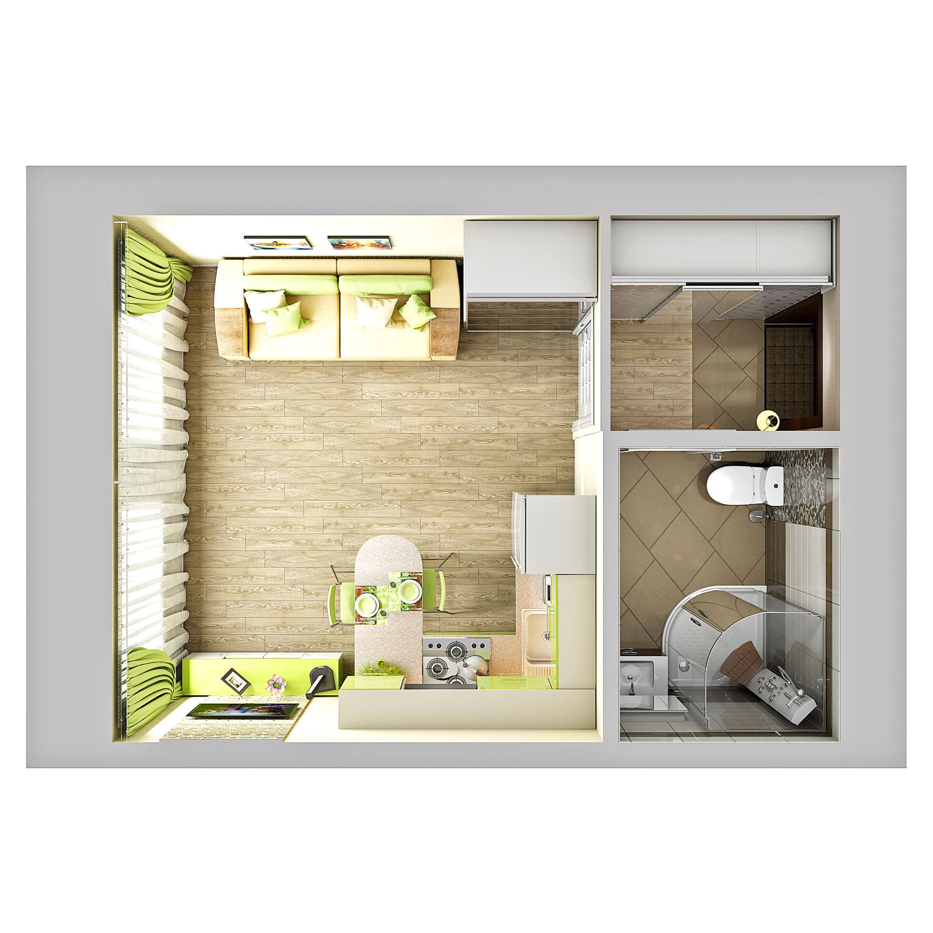 На небольшой площади здесь реализовано практически идеальное пространство для жизни, отдыха и работы.