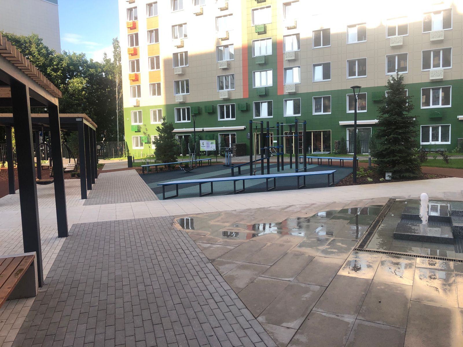 Двор-парк (фонтан, двухуровневые павильоны, амфитеатр, мосты, подвесные качели, батуты, скамьи, игровые пространства) Автоматическая система передачи показаний приборов в УК.
