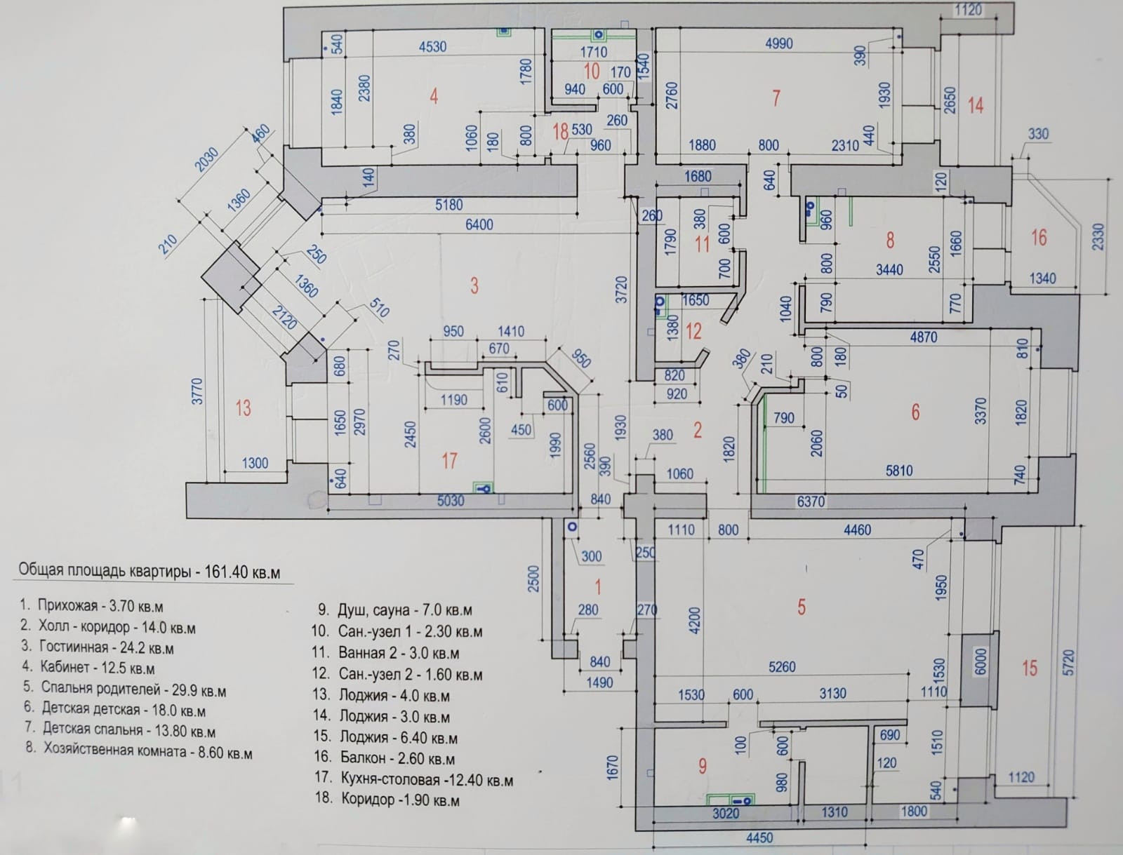 Большая мастер-спальня с с/у с душевой кабиной и сауной. Две детские комнаты, кабинет, отдельная постирочная с балконом, совмещённая с кухней гостиная с эркером, два с/у, один из которых раздельный, кладовка, три лоджии, одна из которых 6-метровая и баклон, полностью изолированная входная зона (уличная пыль не разносится по квартире). Оборудование: 6 сплит-систем, в каждой комнате, включая постирочную (удобно, если нужно быстро высушить бельё). Небольшая сауна, отделанная липой.
