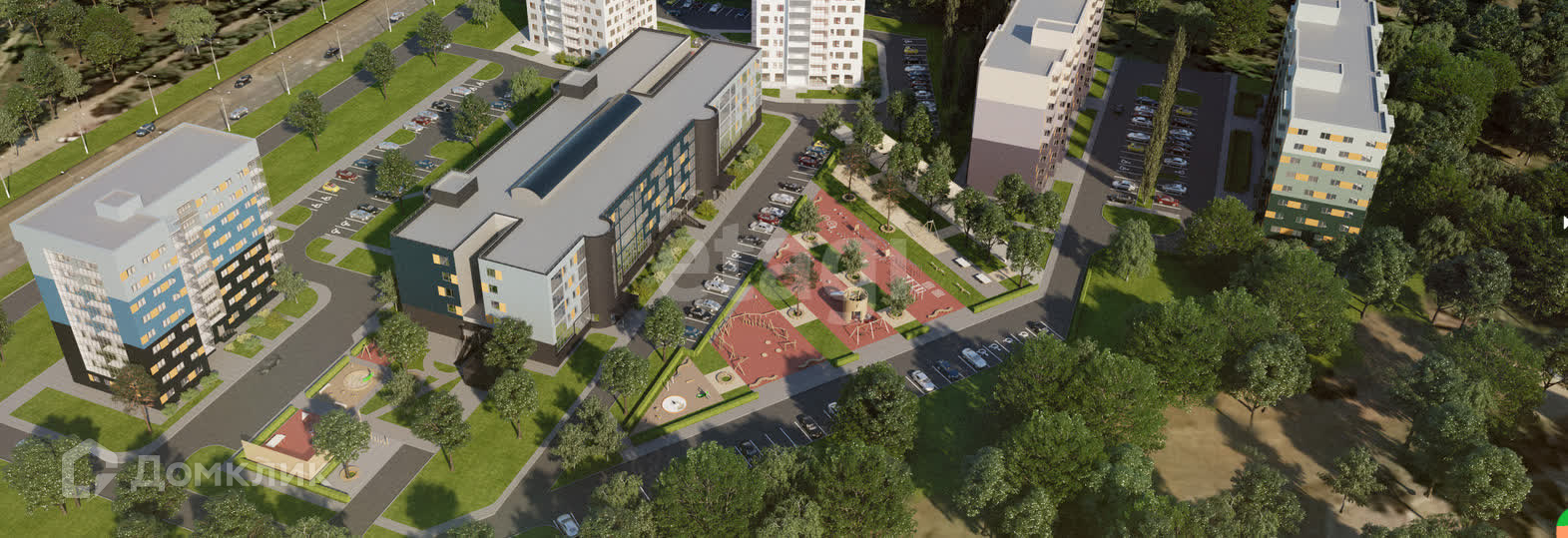 Дворы: спортивные, детские площадки, прорезиненное покрытие, озеленение.