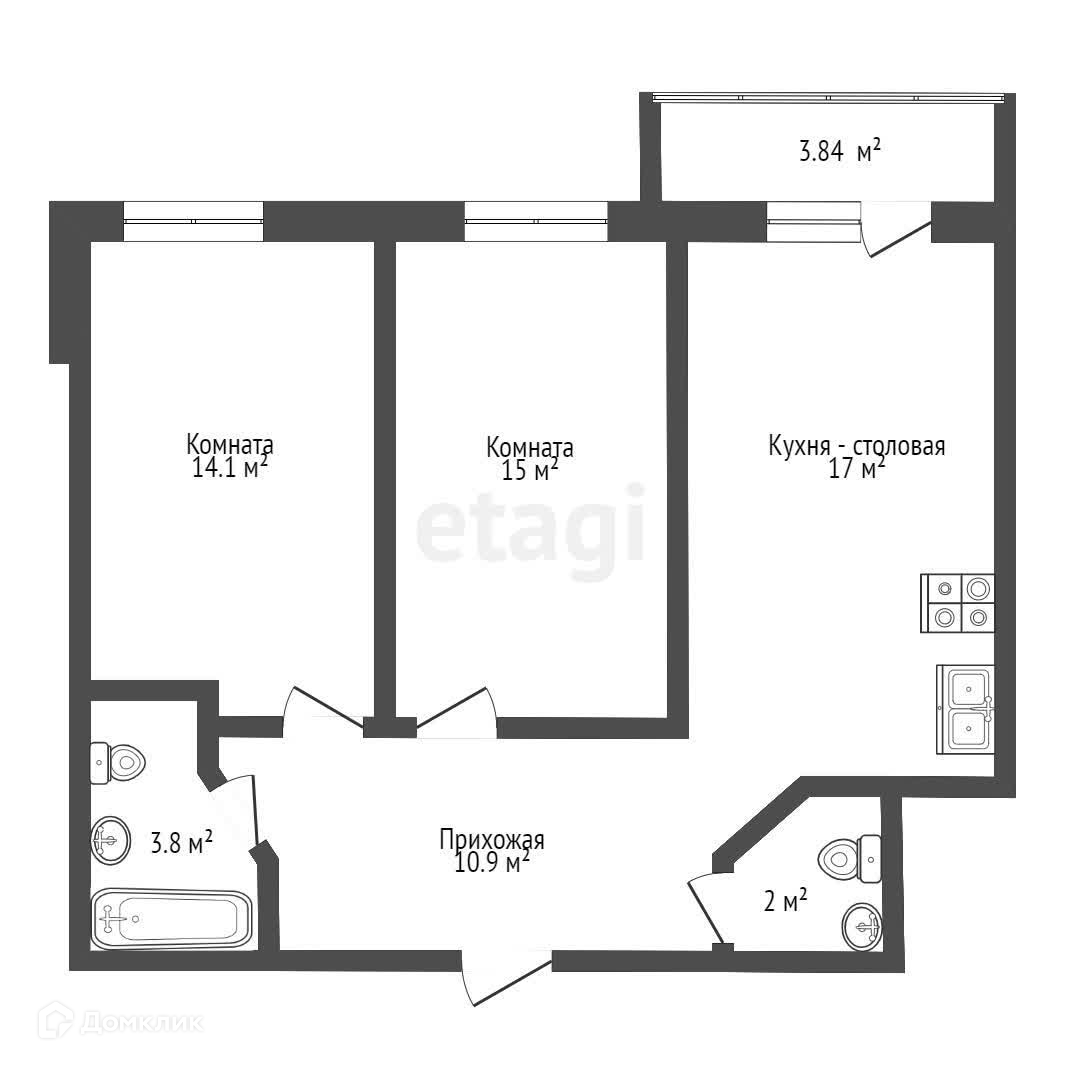 Просторная кухня-гостиная 15 кв.м., комната 12 кв.м., балкон с панорамным остеклением.