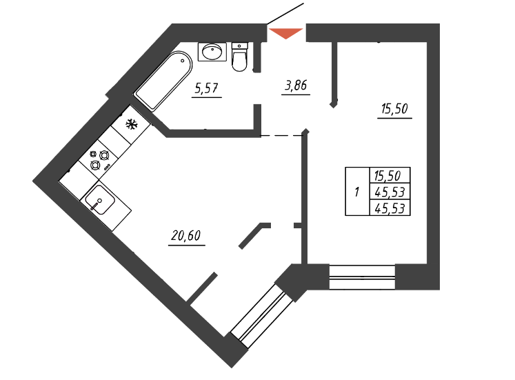 Общая площадь 45.53 м2