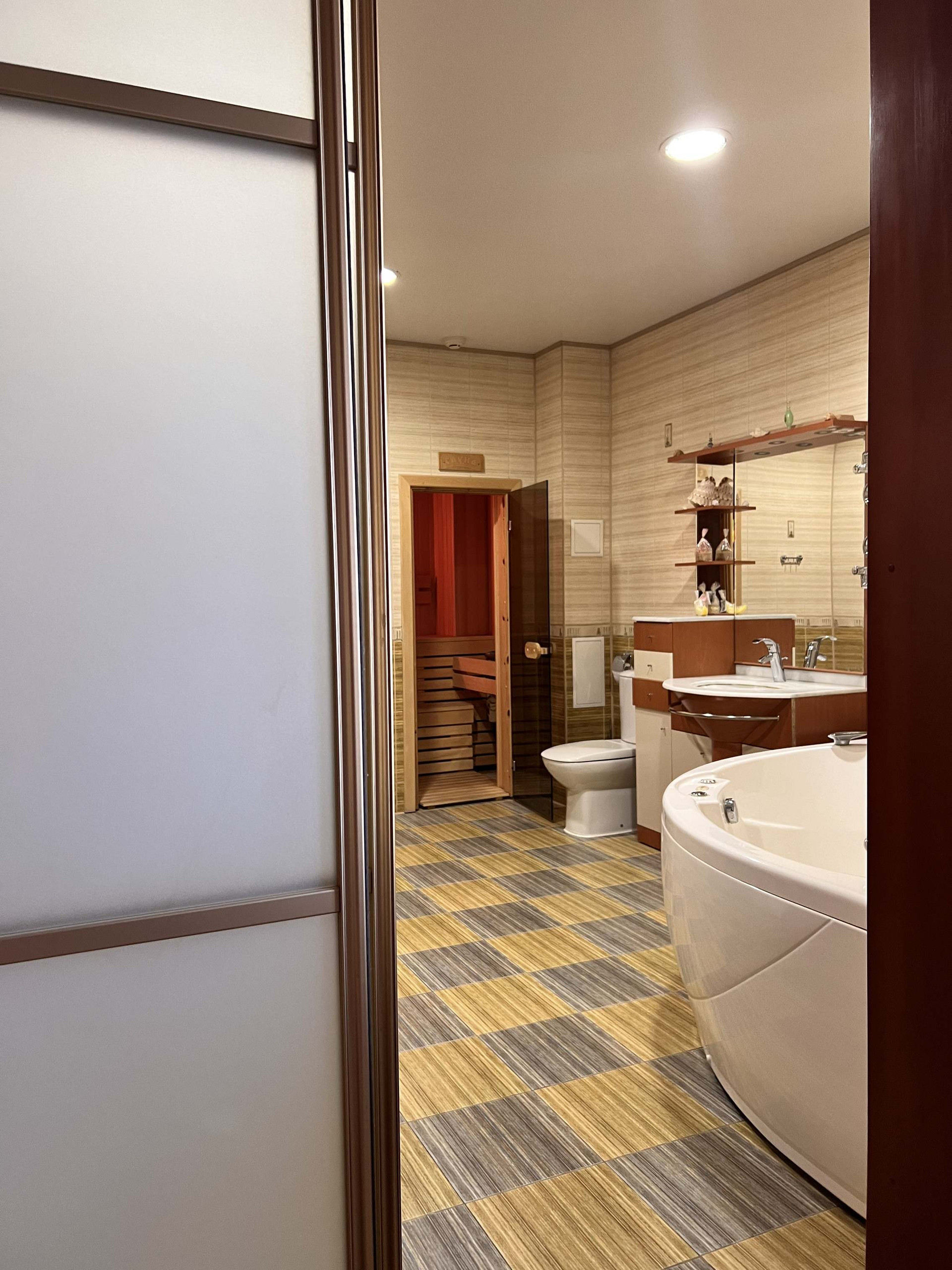 В квартире находятся два балкона, два санузла, гардеробная, кладовка и сауна.
