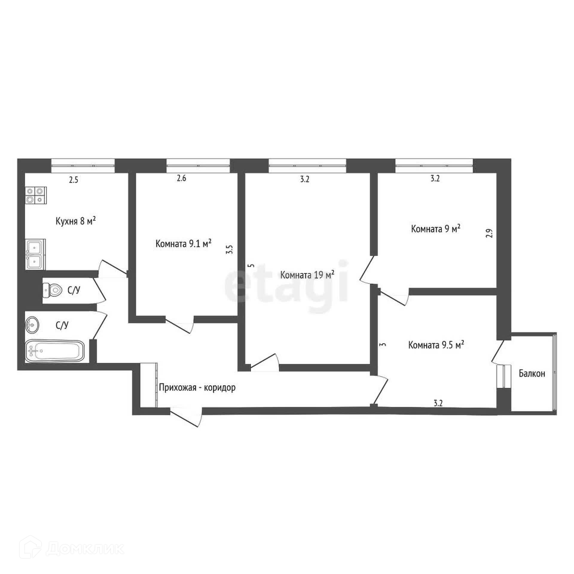 - Общая площадь квартиры составляет 63 кв.м., жилая 46,6 кв.м. включая четыре спальни 19 кв.м., 9,5 кв.м. с выходом на застекленный балкон и две по 9 кв.м., а также кухню 8 кв.м. и раздельный санузел.