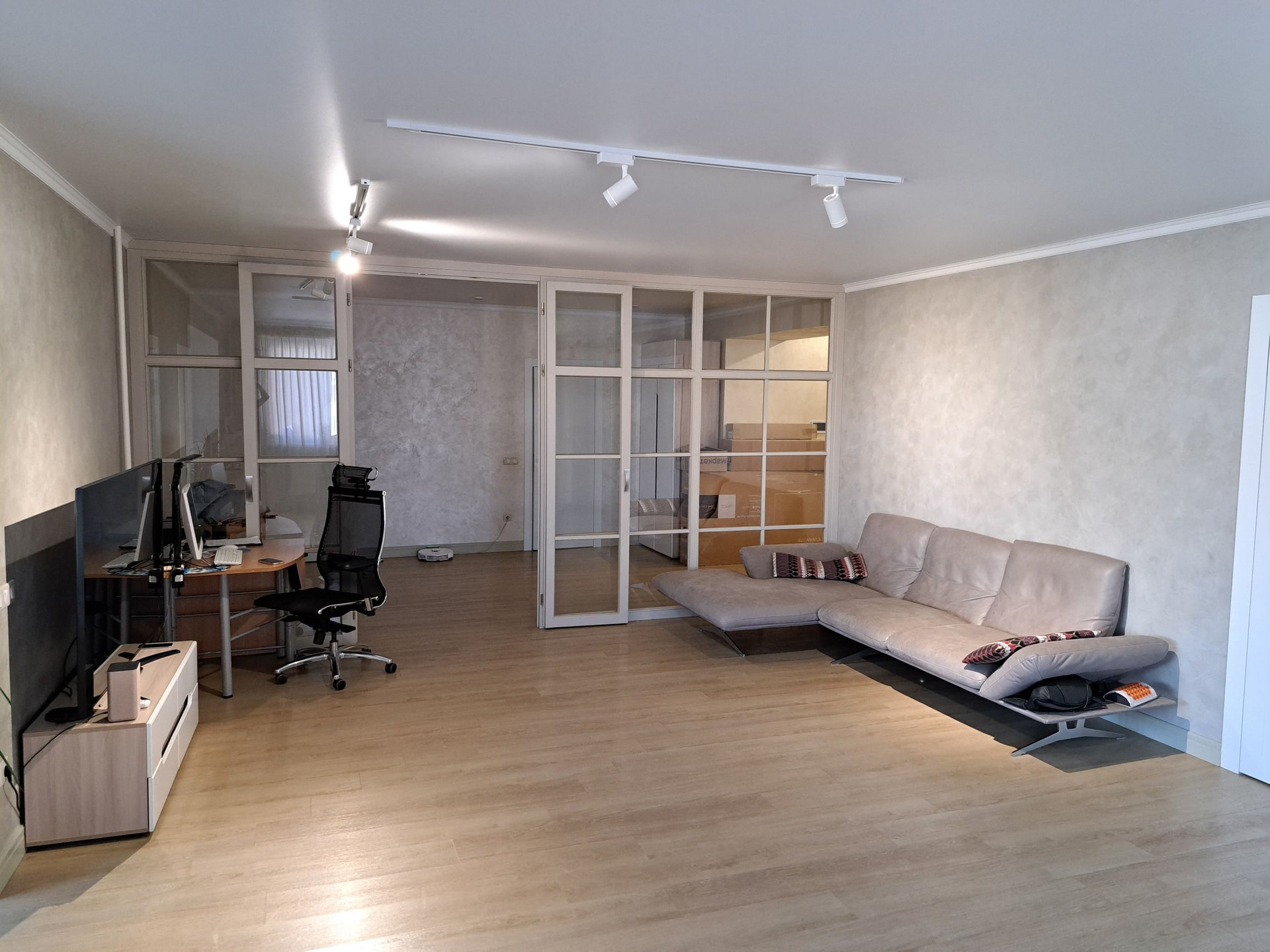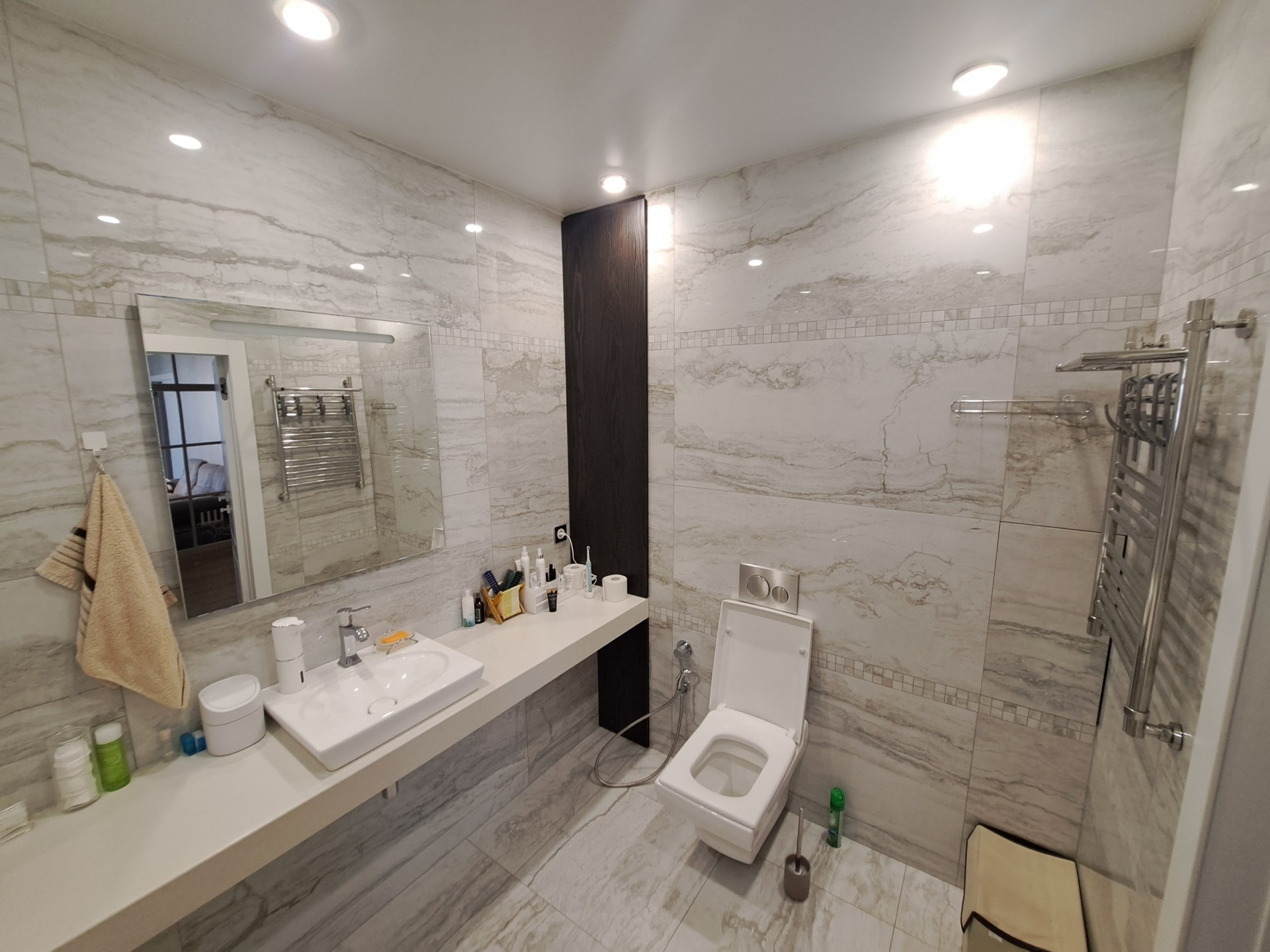 В квартире сделан дизайнерский ремонт, что создает уникальную и комфортную атмосферу. Просторная кухня площадью 23.5 квадратных метров — идеальное место для кулинарных экспериментов и семейных ужинов. В квартире есть два санузла: один совмещенный и один отдельный.