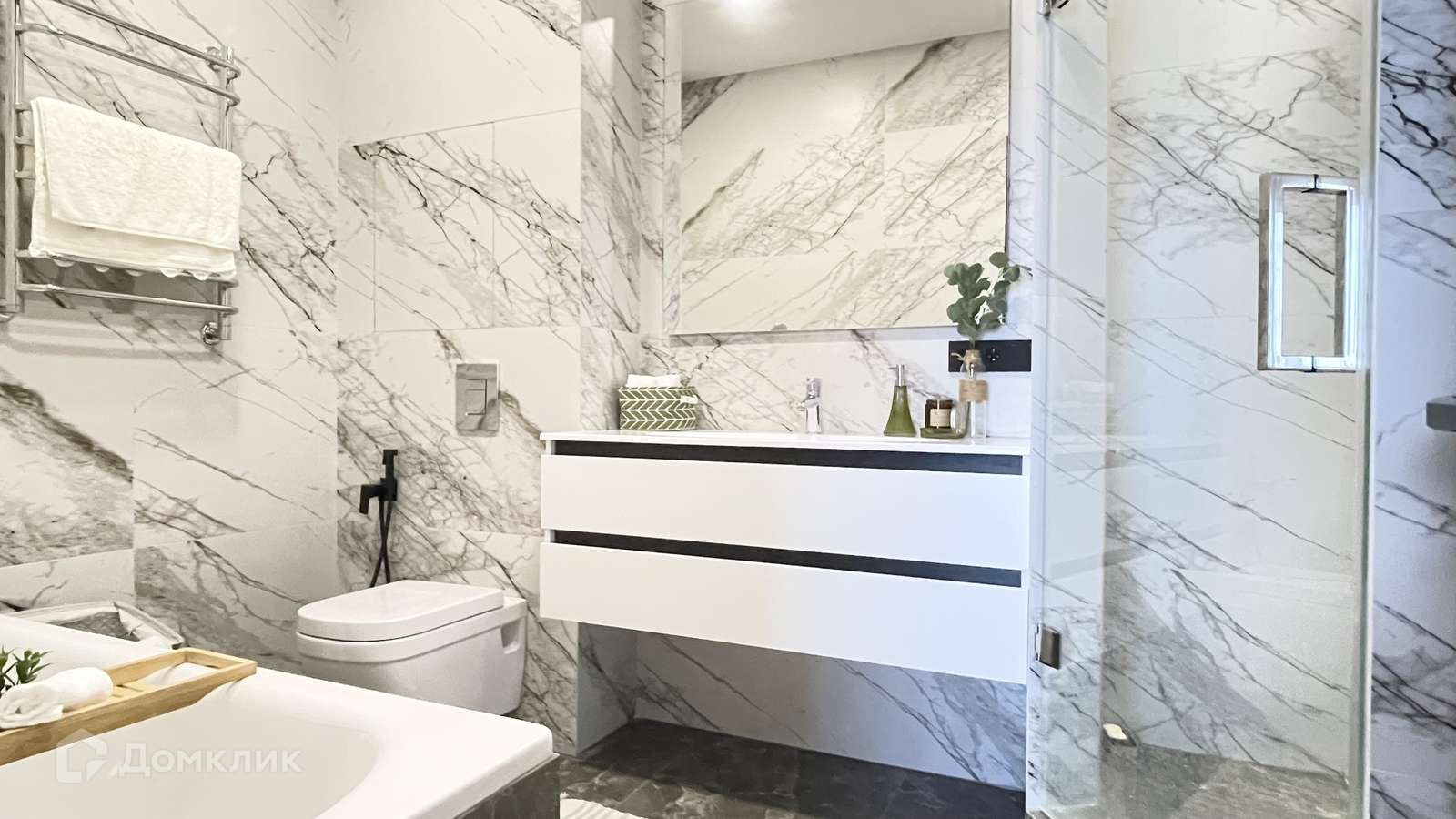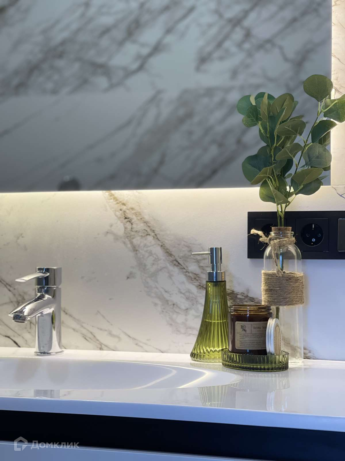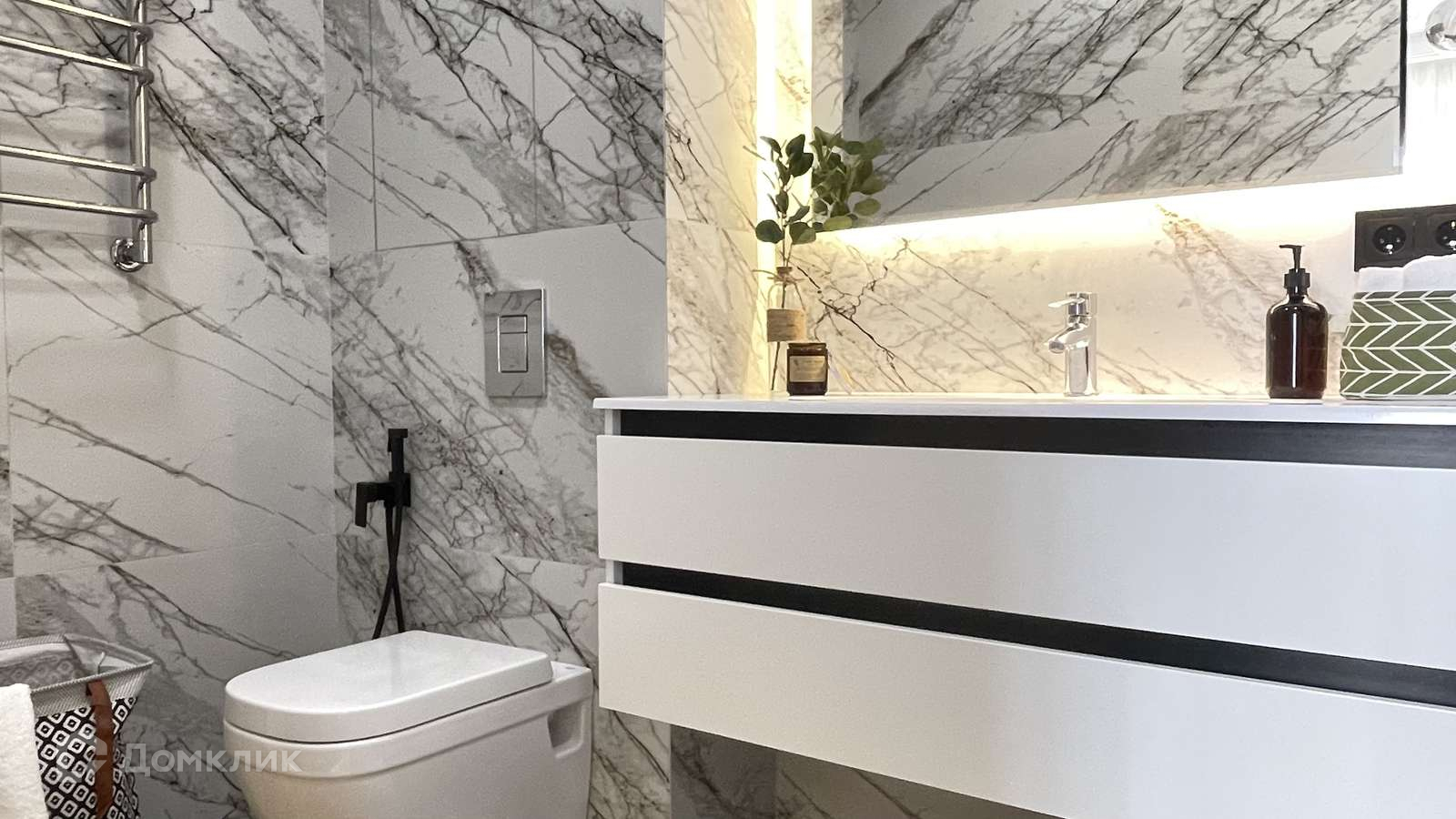 При ремонте использованы высококлассные материалы, некоторых из которых уже нет в России. Предусмотрена вытяжка в гардеробной. Выведено несколько точек дополнительной светодиодной подсветки (по датчику над полом, карнизы, ТВ зона).