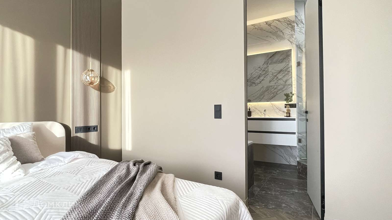 Грамотно продуманная планировка с выделением санузла в мастер-спальне и просторной гардеробной комнаты в коридоре.