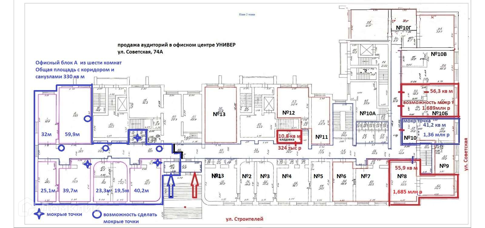 Продается офисный блок А универсального назначения в офисном центе УНИВЕР, состоящий из шести офисов с отдельным входом с улицы. Два помещения из них с "мокрыми точками" и четыре домовых стояка с возможностью сделать "мокрые точки". С улицы отдельный вход.(см. левую часть схемы).