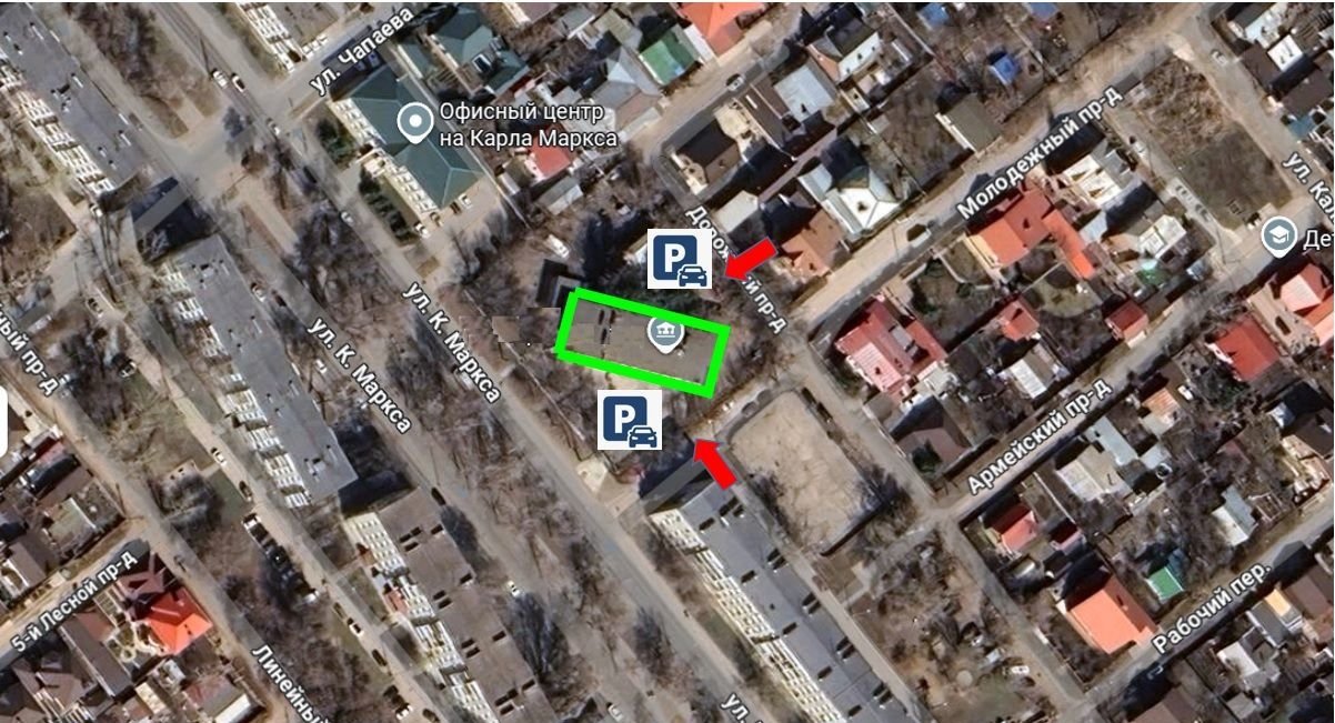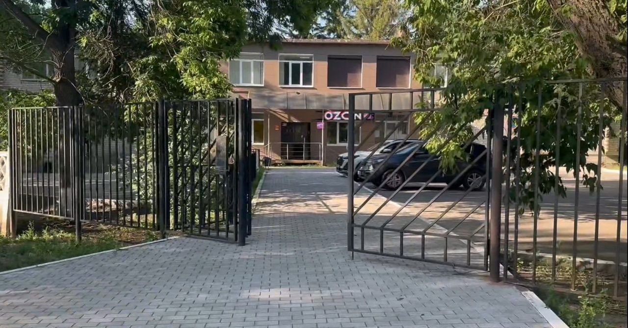 - большая огороженная парковка с обеих сторон здания