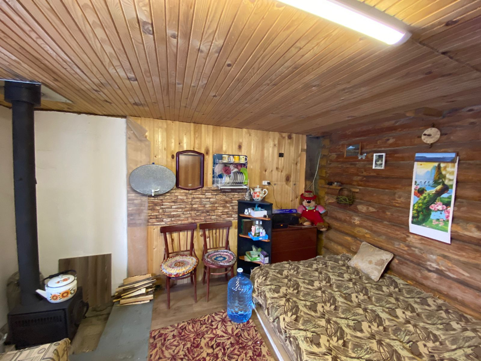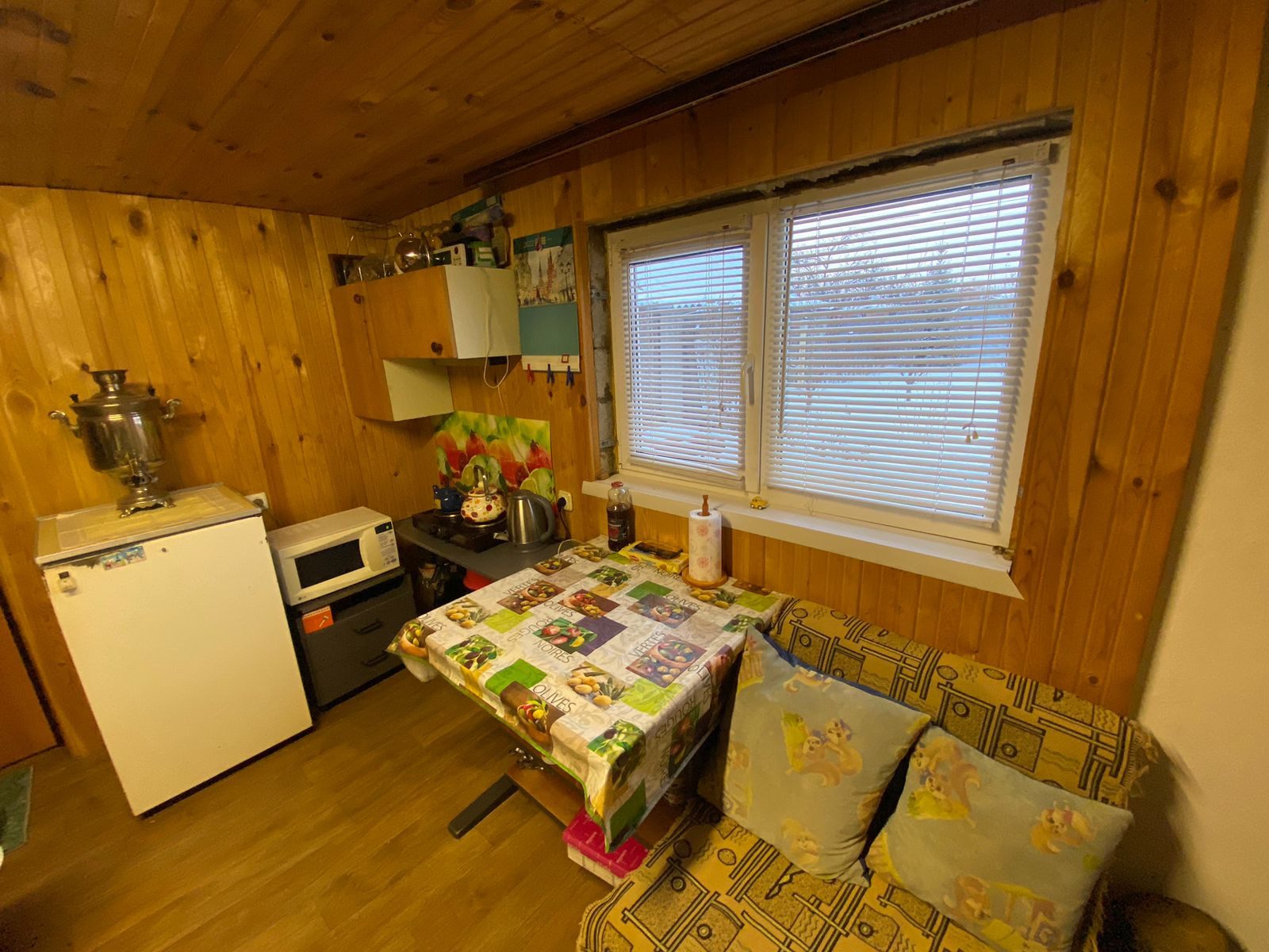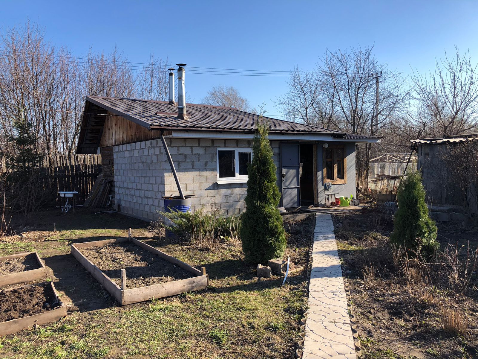 В доме есть печка, топится дровами, зимой гостевая комната прогревается за 30 минут, поэтому можно смело ночевать зимой или приезжать на отдых в баню в выходные. Электричество круглый год. Вода постоянно с апреля по октябрь. Сделана разводка пластиковых труб по участку. Туалет деревянный на улице, есть будка для инструментов и инвентаря. Забор профлист, есть заезд для машины.  На массиве есть магазин и круглогодичная охрана. Имеются насаждения (абрикос, груша, яблоня, вишня, виноград, черноплодка, шелковица, смородина, клубника) Торг уместен.