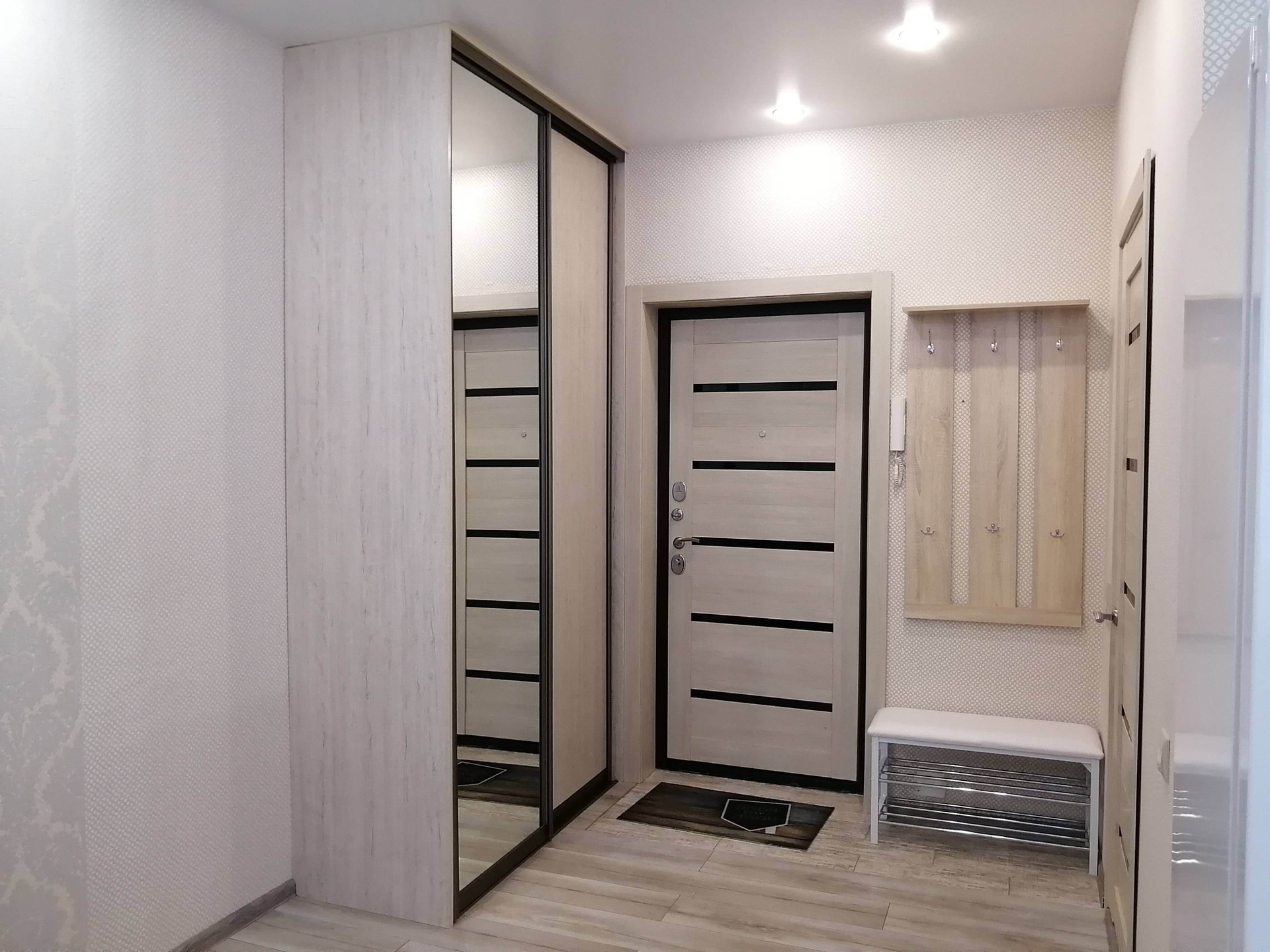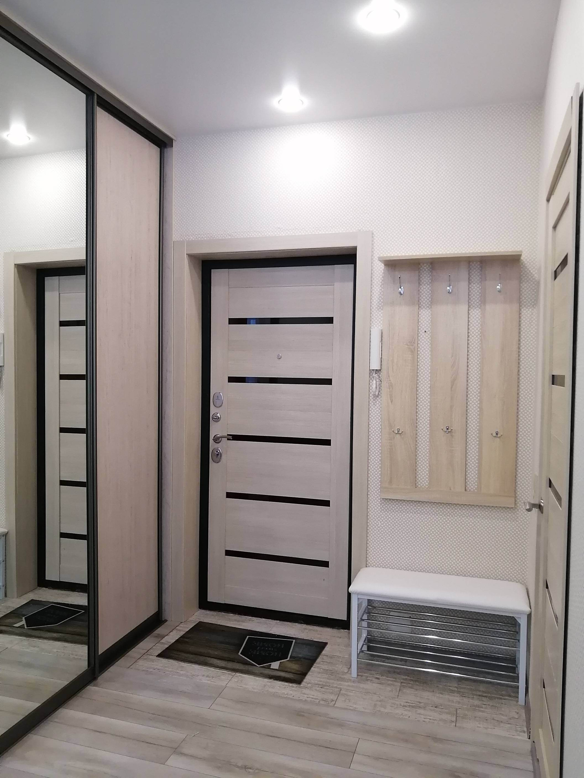 Мебель: шкаф купе, диван, кухонный уголок, обеденный стол, стулья, вешало в прихожей, комод.