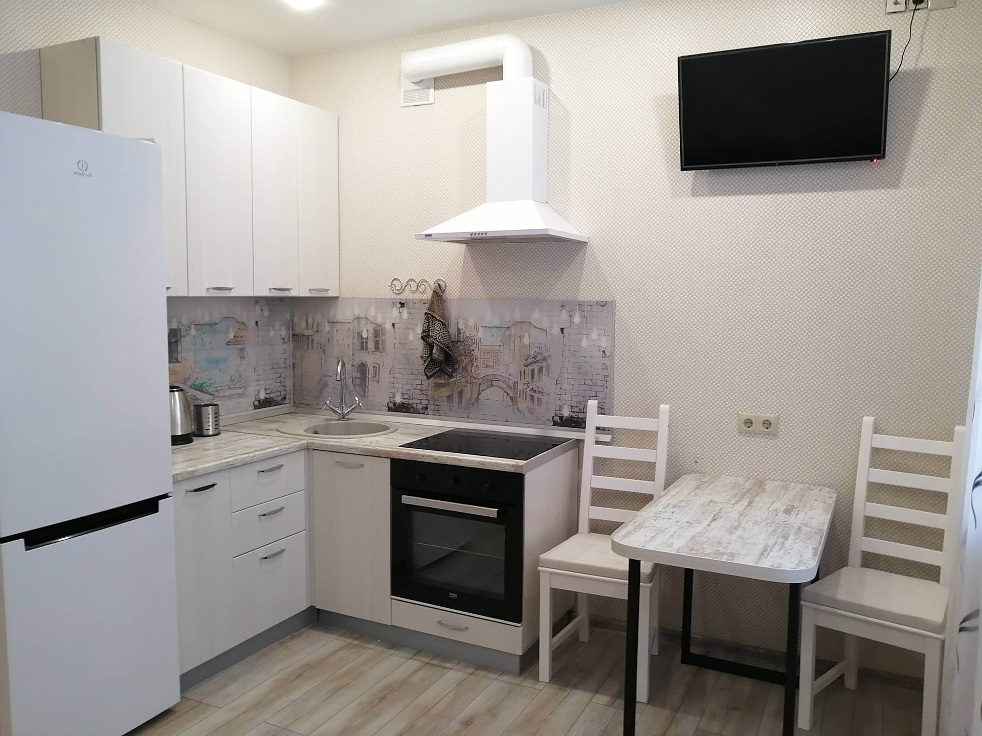 Техника : духовой шкаф, варочная панель, вытяжка, холодильник, конденционер, стиралка, микроволновка, чайник, утюг.