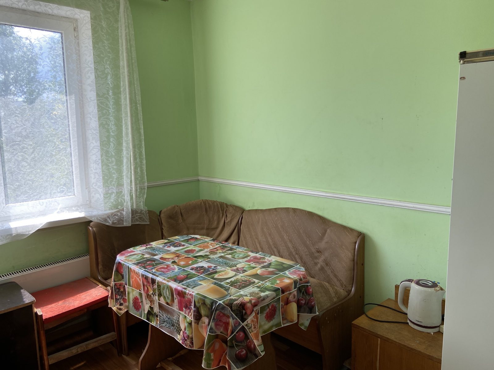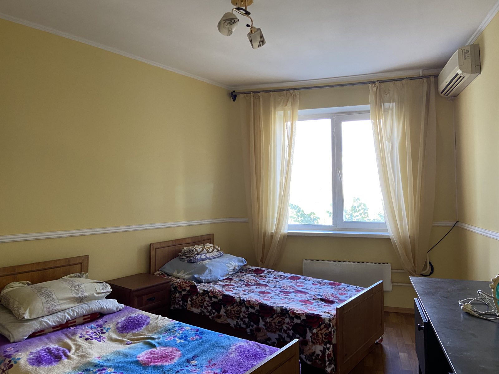 Есть шкафы, 3 кровати, 4 дивана, кухонный гарнитур, стол, стулья, холодильник, стиральная машинка, ТВ, СВЧ, кондиционер, посуда, постельные принадлежности.