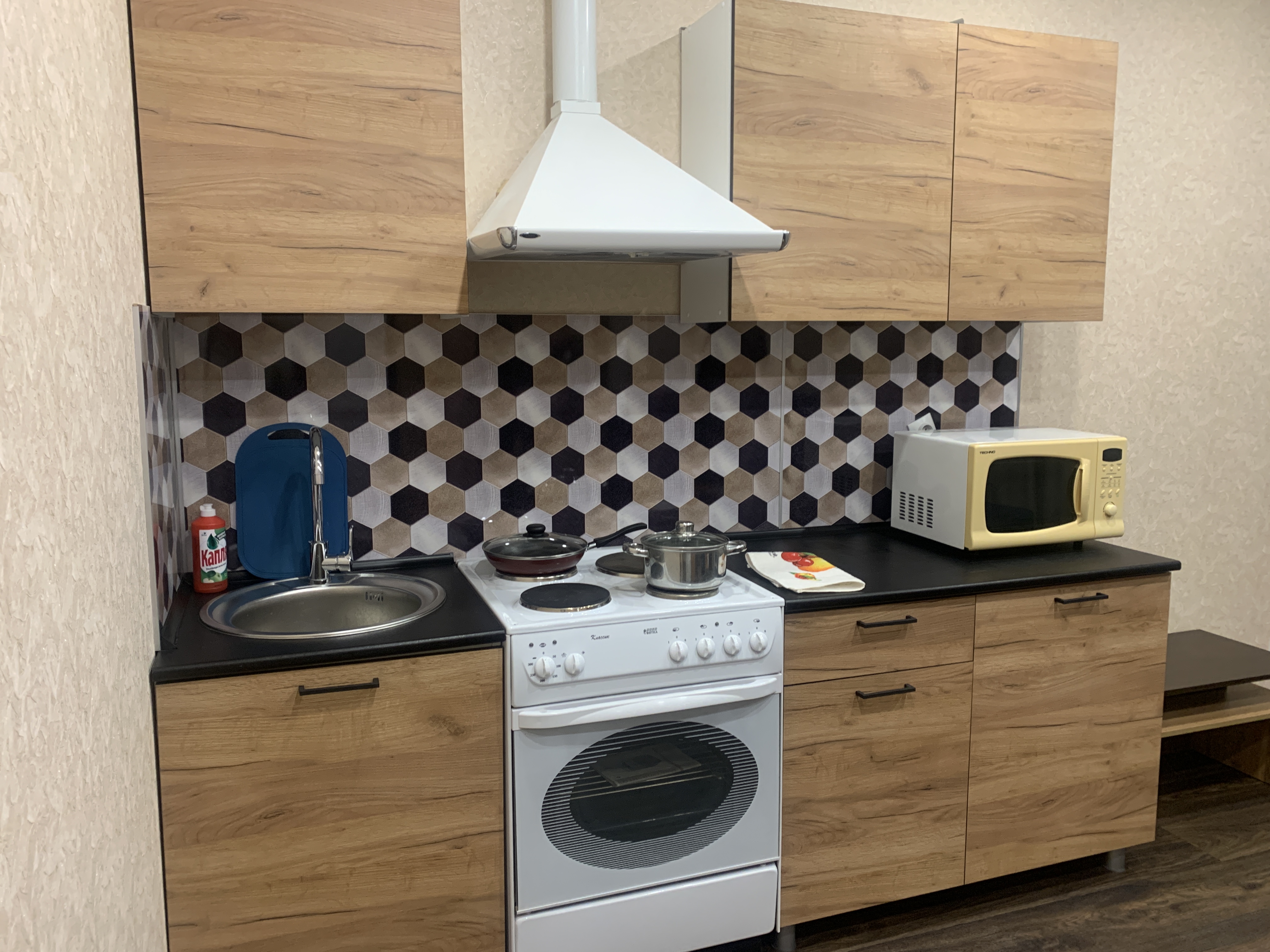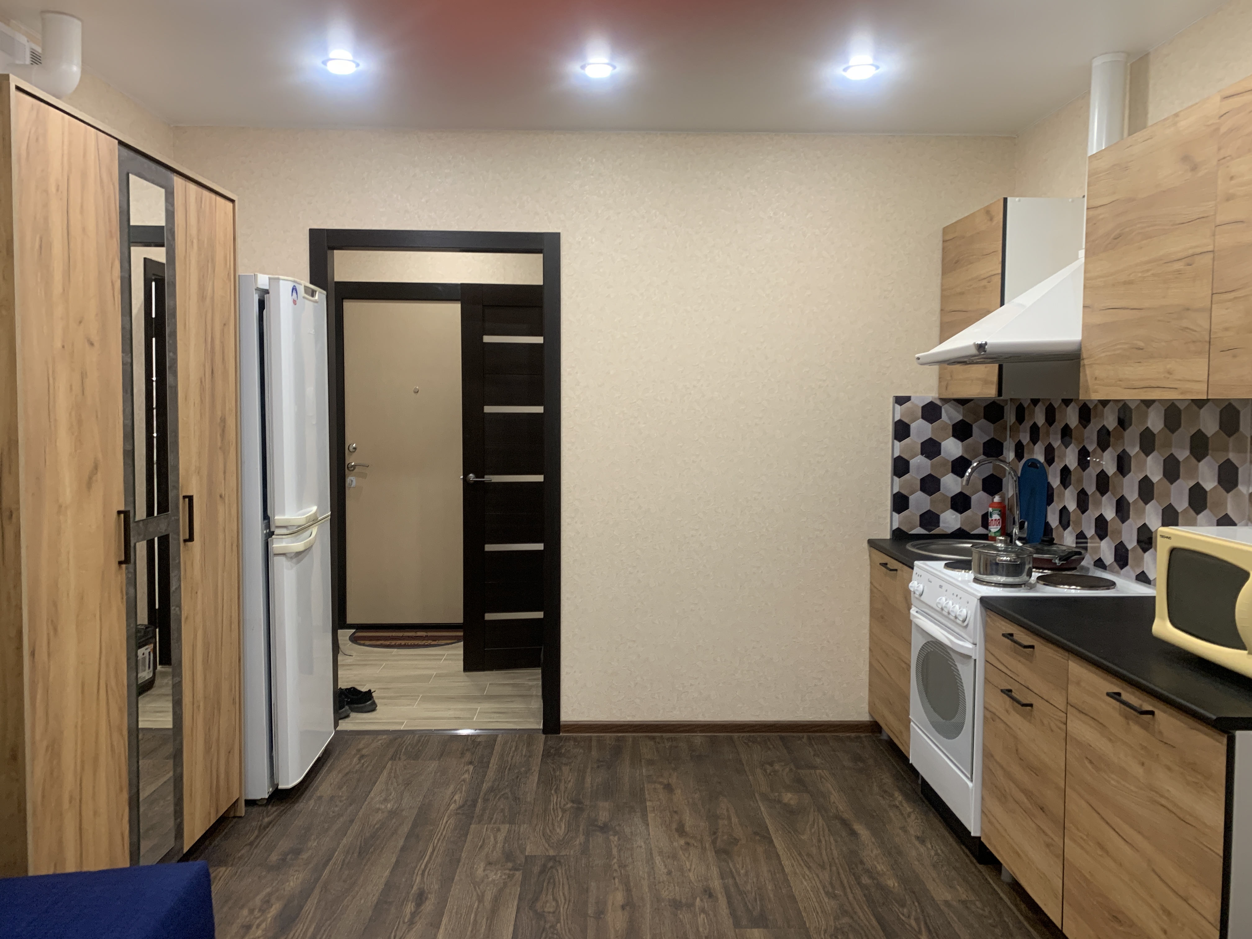 - в кухонной зоне: кухонный гарнитур, СВЧ печь, электрическая плита, 2-х камерный холодильник, имеется посуда. По требованию арендатора можем привезти обеденный стол