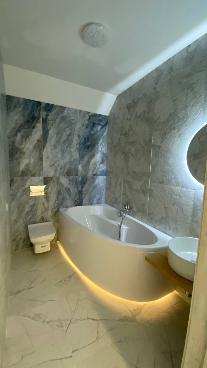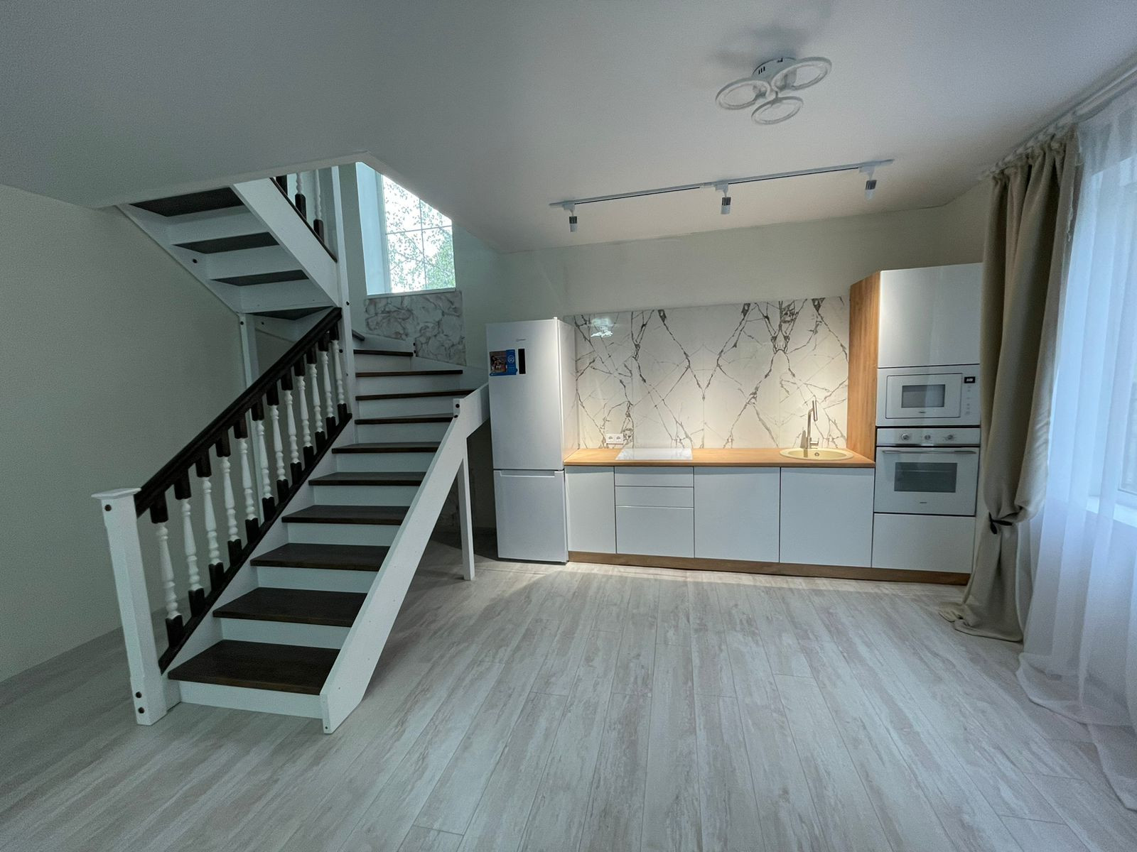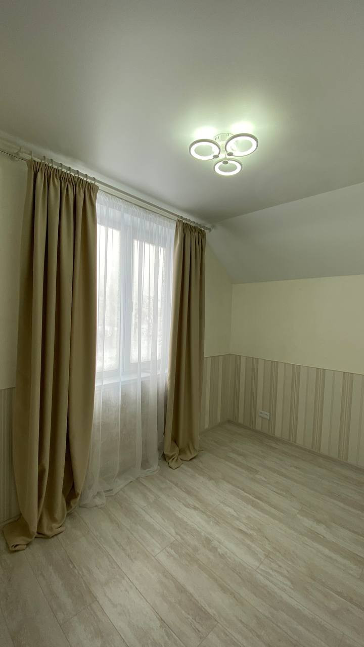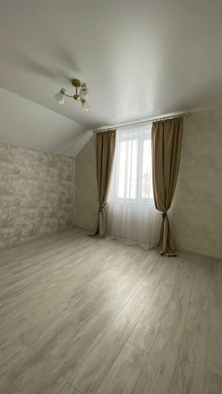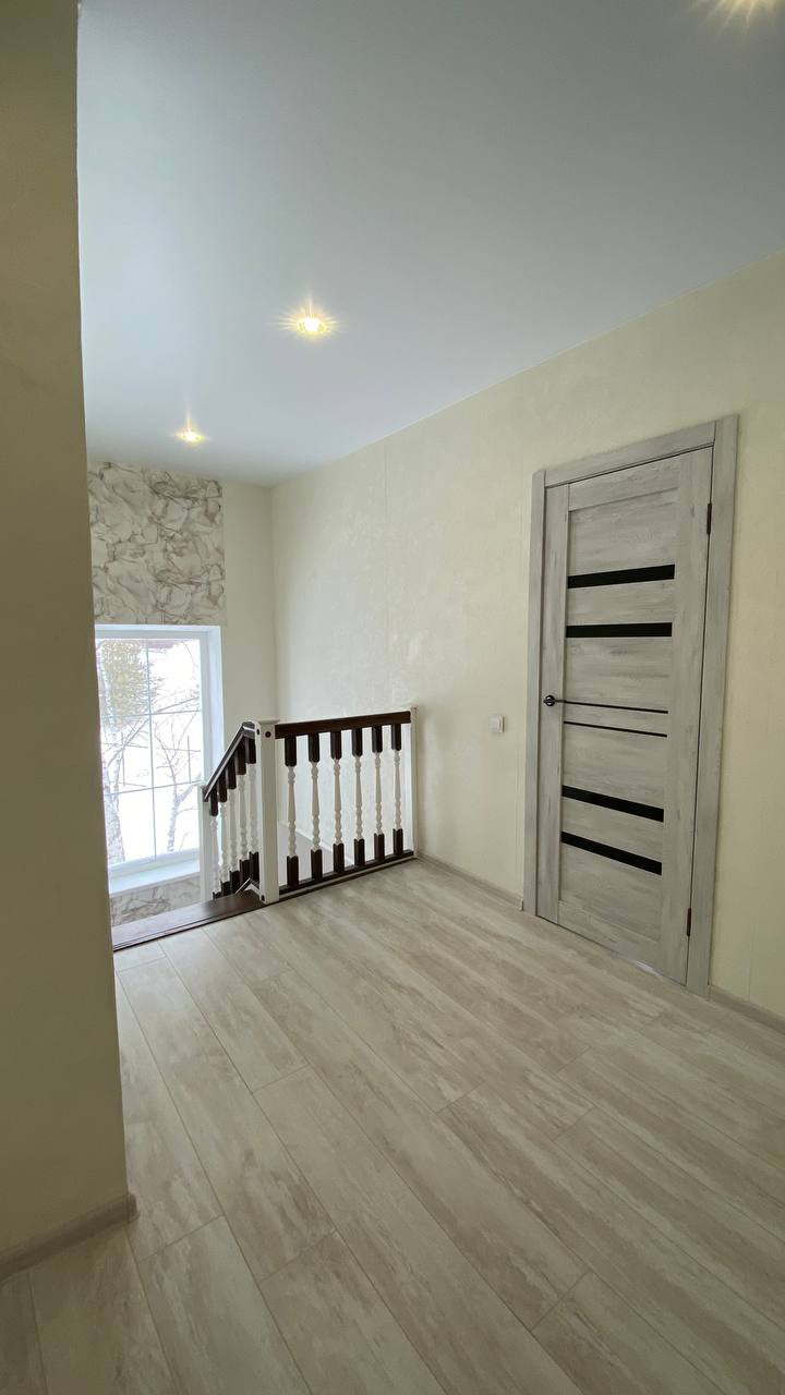 На первом этаже большая гостиная, совмещенная с кухней, обеденной зоной выделенной телевизионной зонной и отдельным выходом на террасу. Большая гардеробная (котельная) с подготовкой под прачечную. Удобная гостевая комната. И просторный санузел, выполненный в дизайнерском ремонте с применением широкоформатного керамогранита LED подсветкой, и дорогой испанской сантехникой. Дизайнерская лестница на второй этаж из массива дерева.