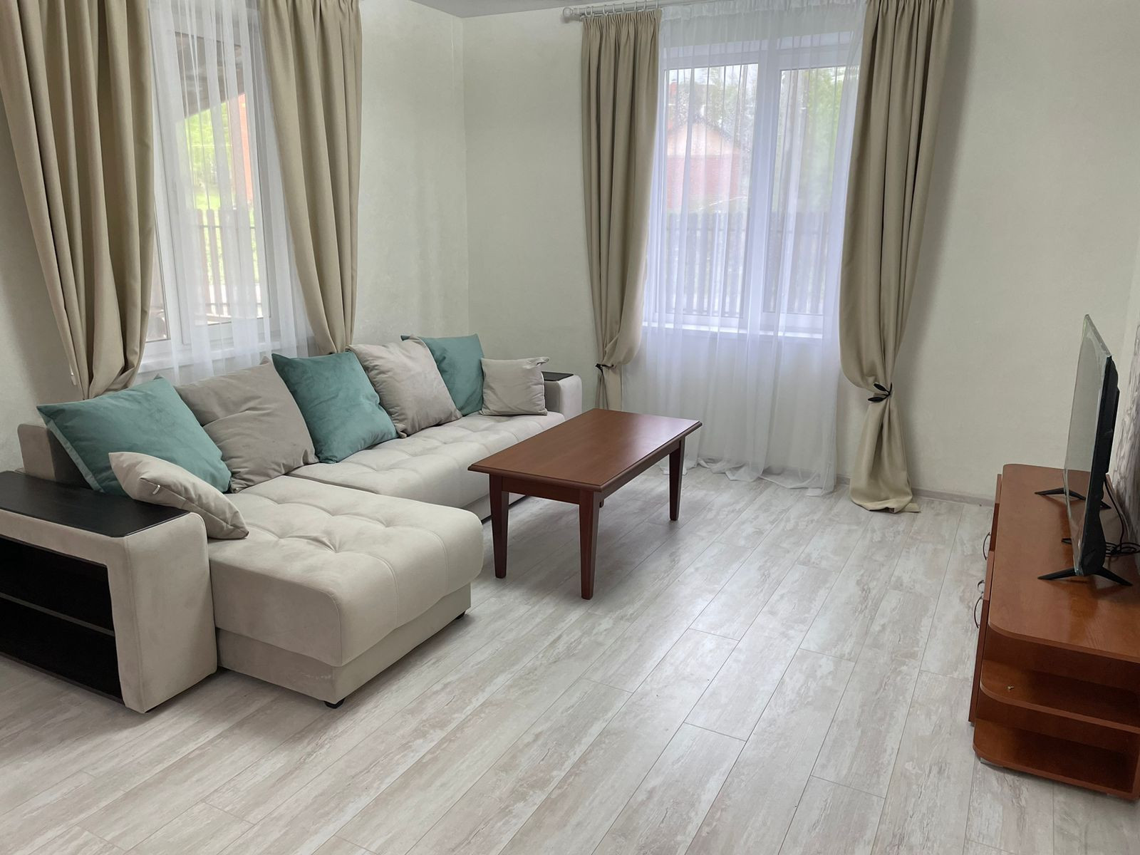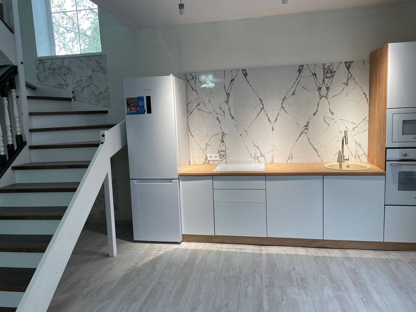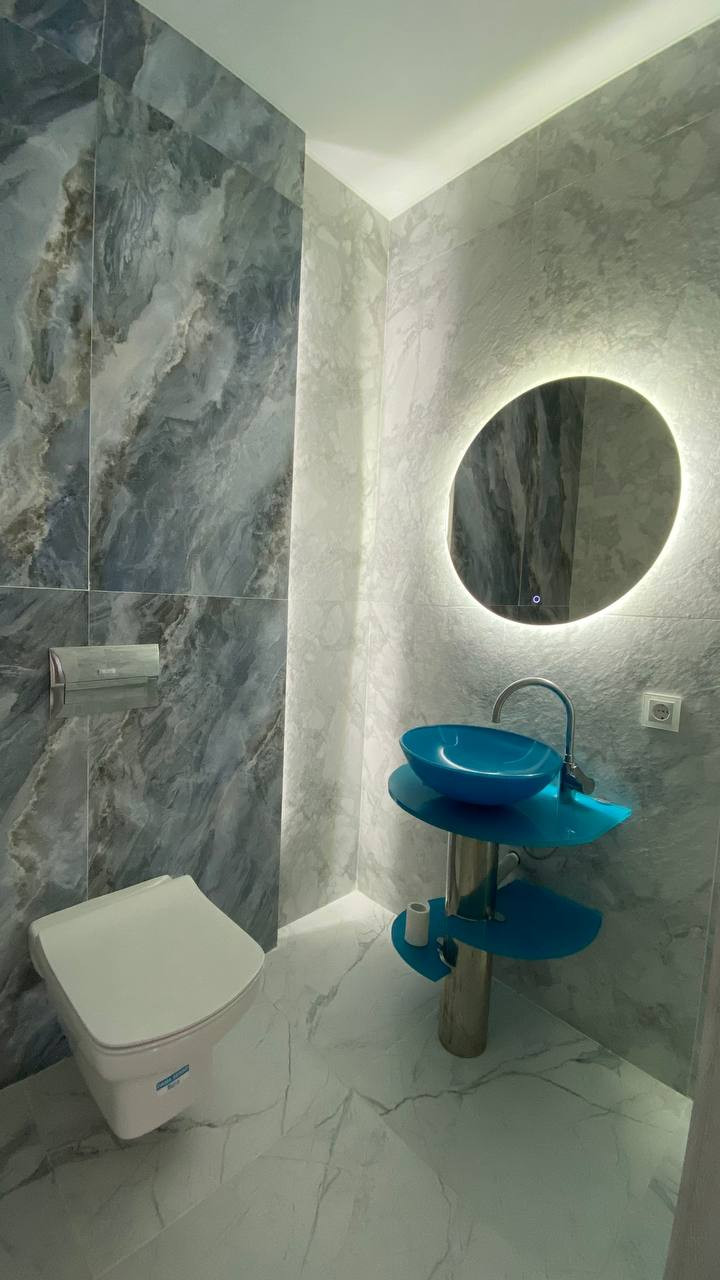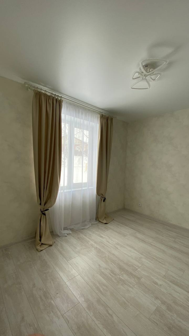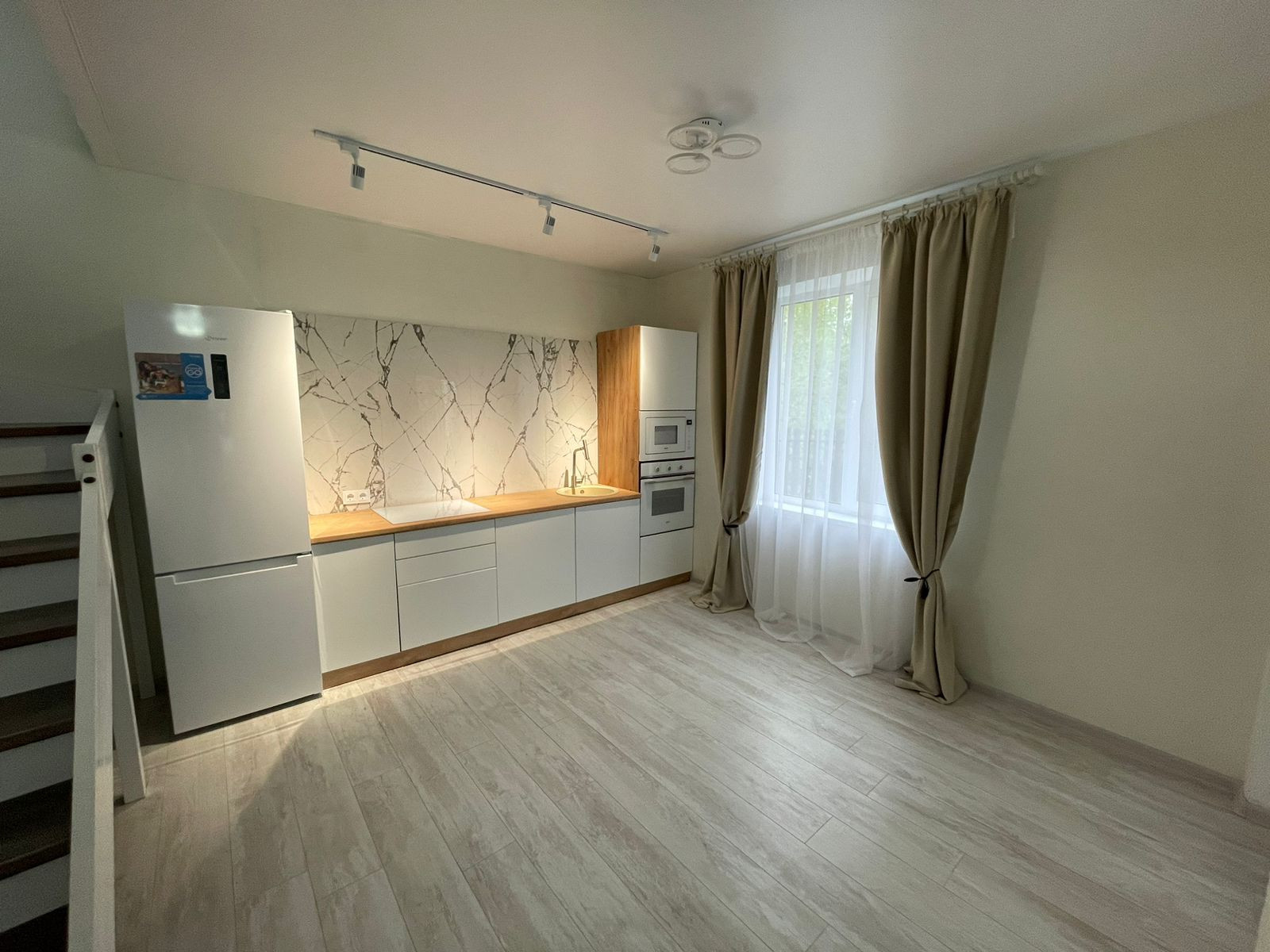 На первом этаже большая гостиная, совмещенная с кухней, обеденной зоной выделенной телевизионной зонной и отдельным выходом на террасу. Большая гардеробная (котельная) с подготовкой под прачечную. Удобная гостевая комната. И просторный санузел, выполненный в дизайнерском ремонте с применением широкоформатного керамогранита LED подсветкой, и дорогой испанской сантехникой. Дизайнерская лестница на второй этаж из массива дерева.