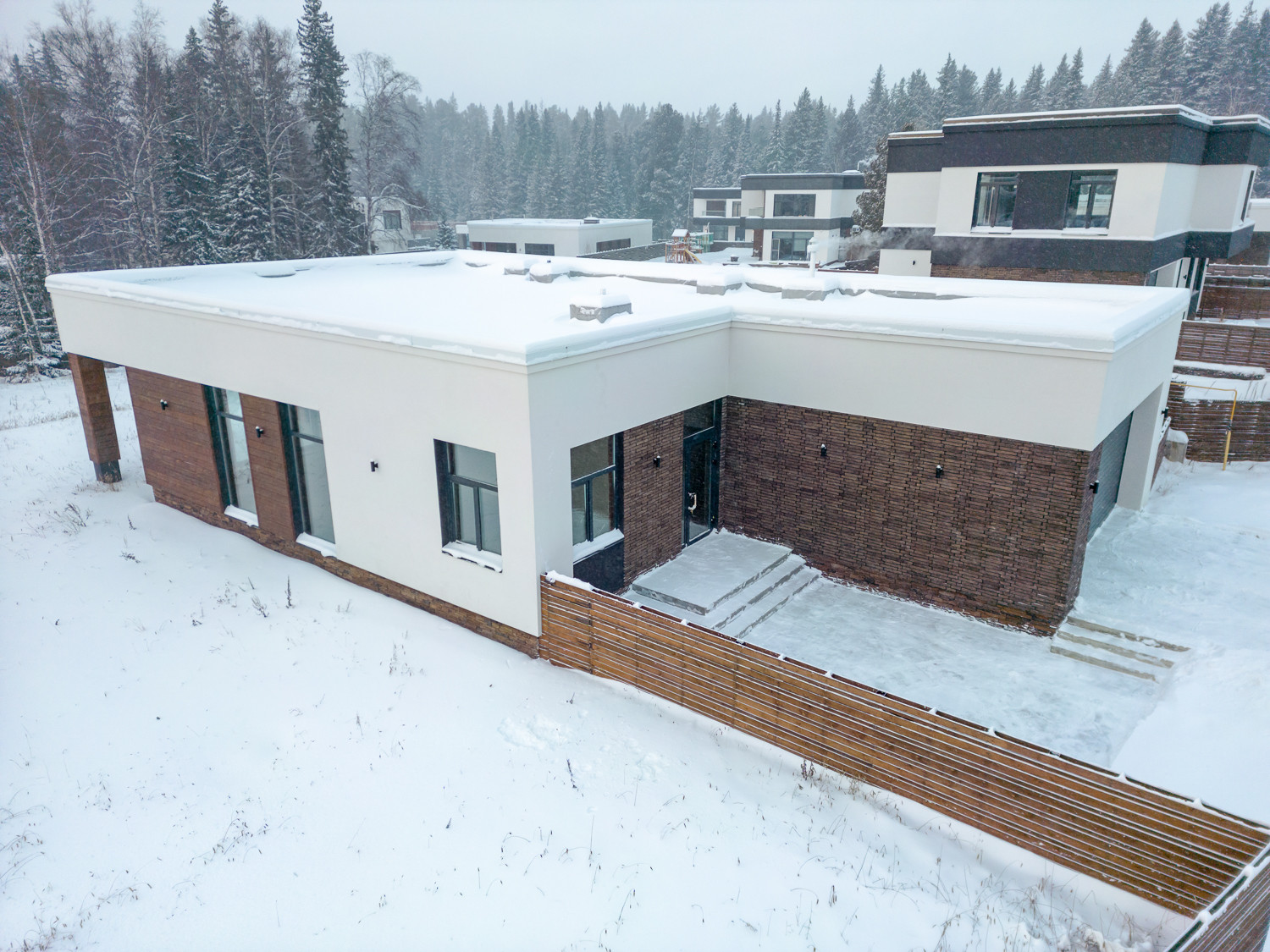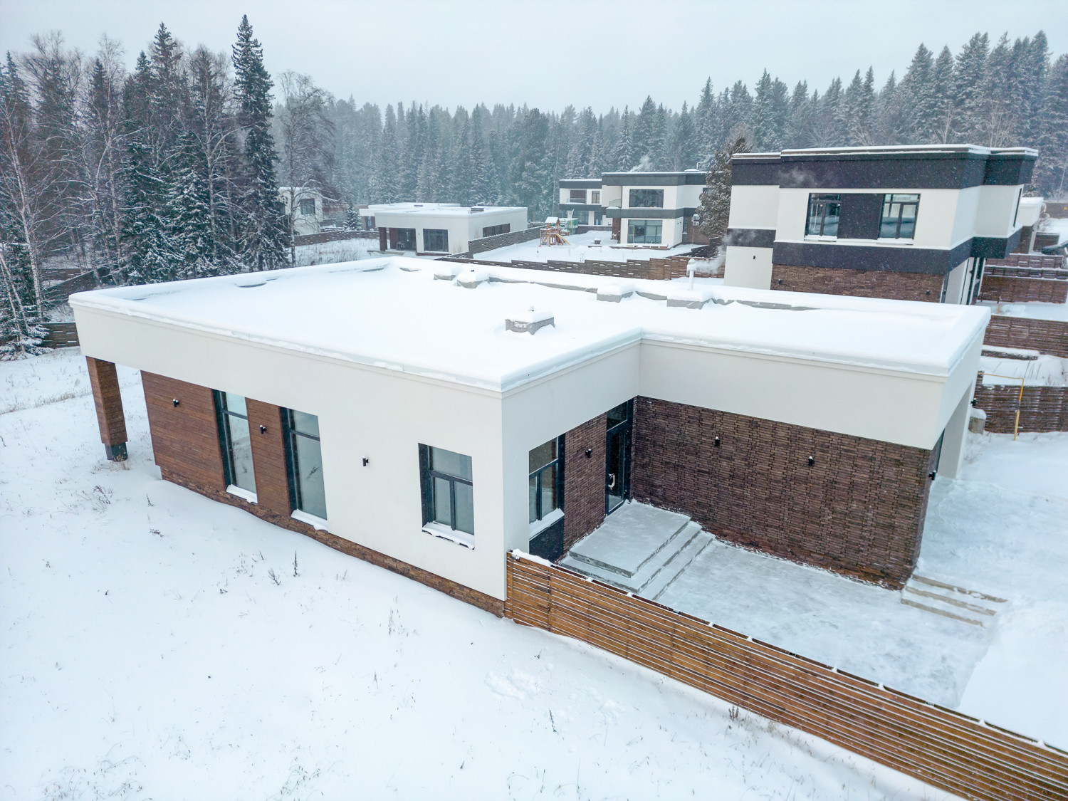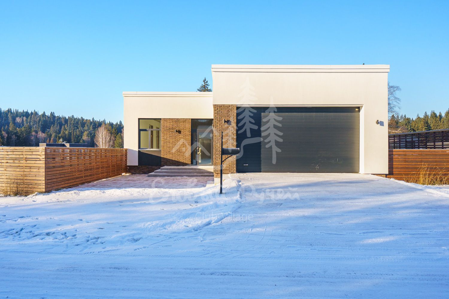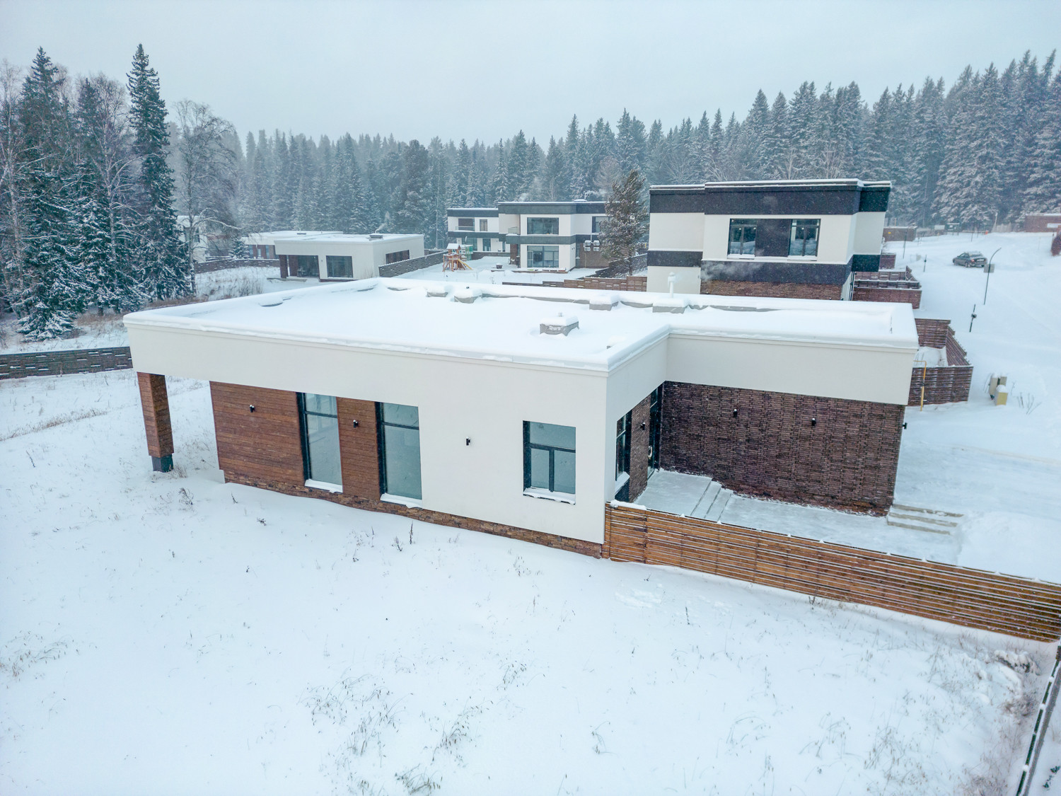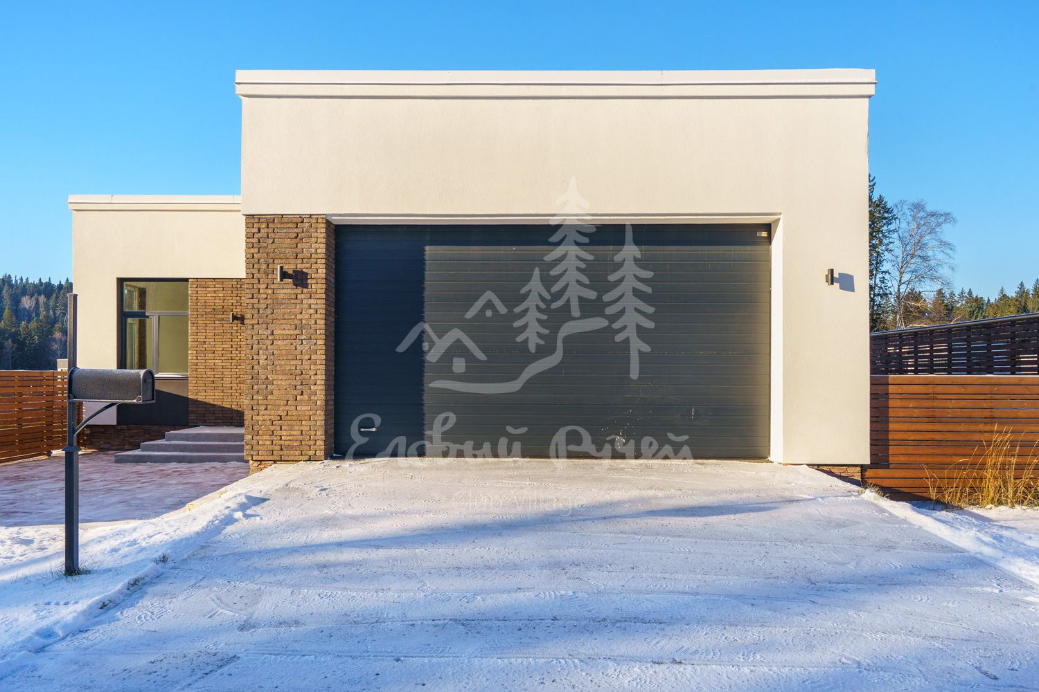 В доме есть теплый гараж на 2 машины с автоматическими воротами. Весомым преимуществом каждого дома является то, что уборка снега перед домом или стрижка газонов снаружи участка ведется силами управляющей компании.