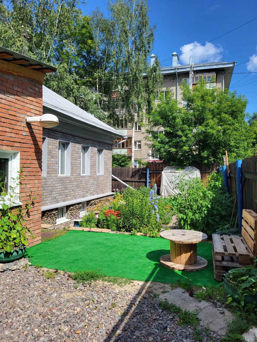 Около дома небольшой земельный участок для отдыха на свежем воздухе или огорода. Двор огорожен деревянным забором, большие металлические ворота.