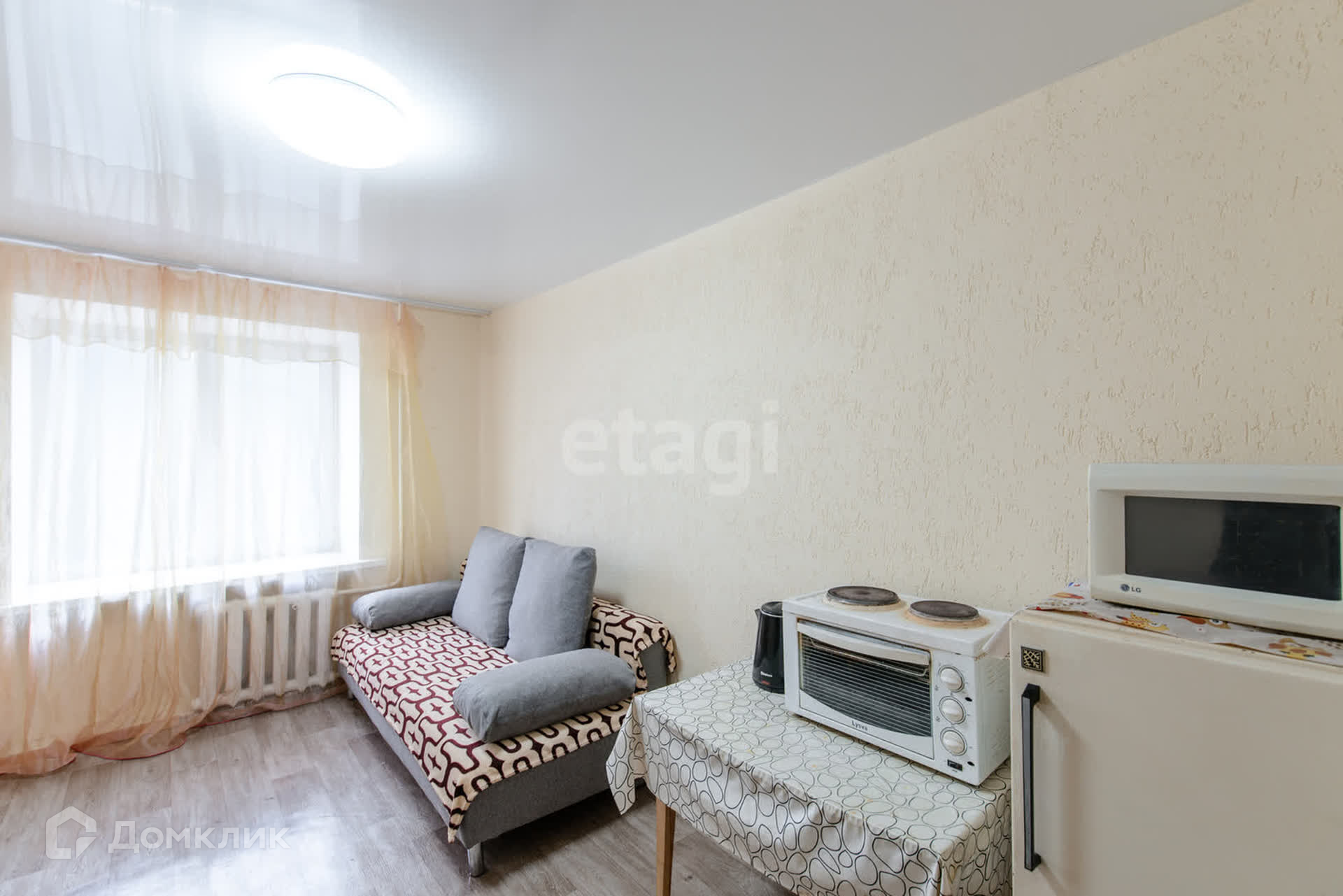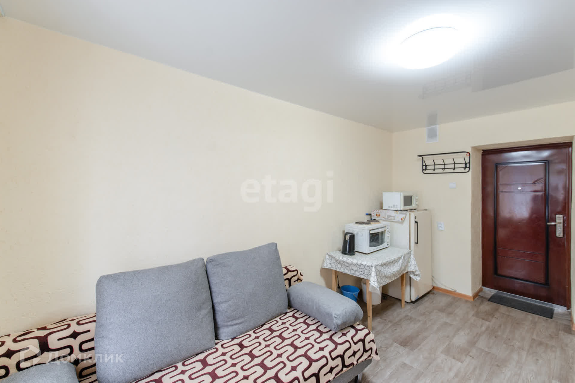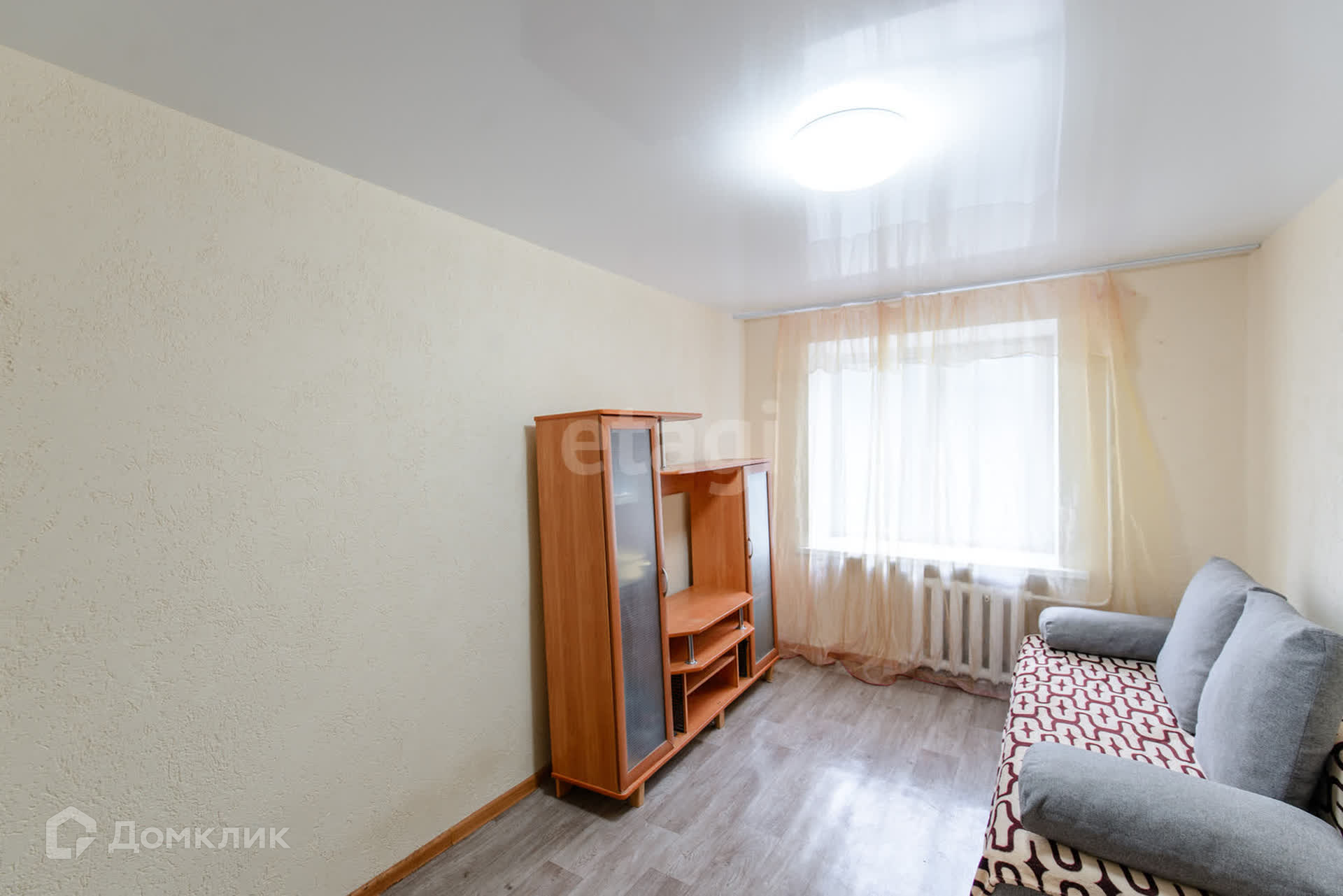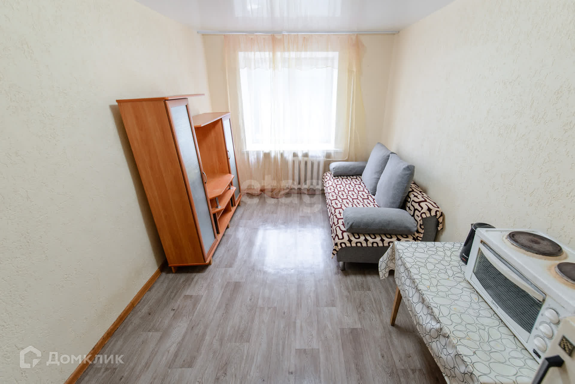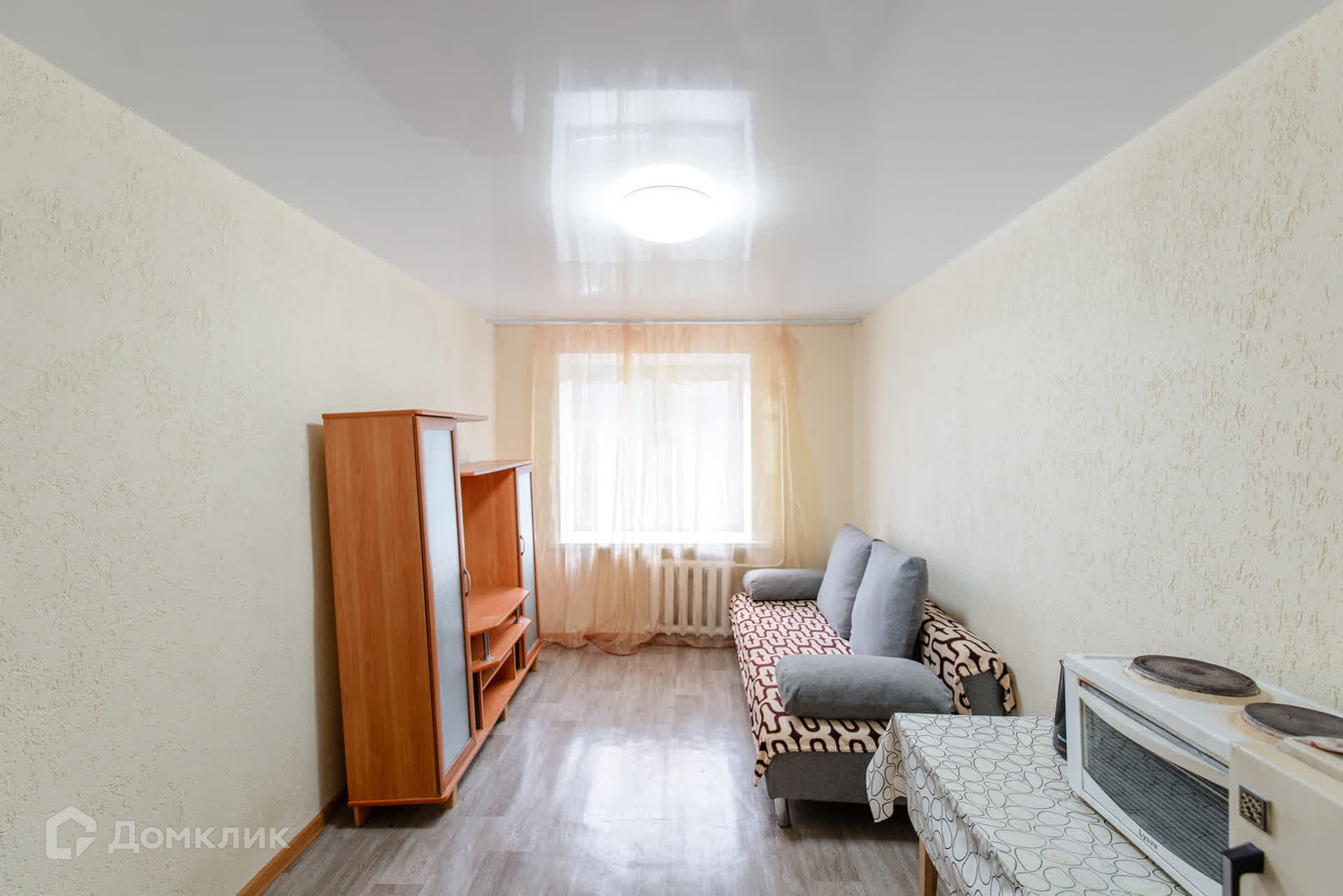 В комнате новый диван, укомплектована для жизни всем необходимым.