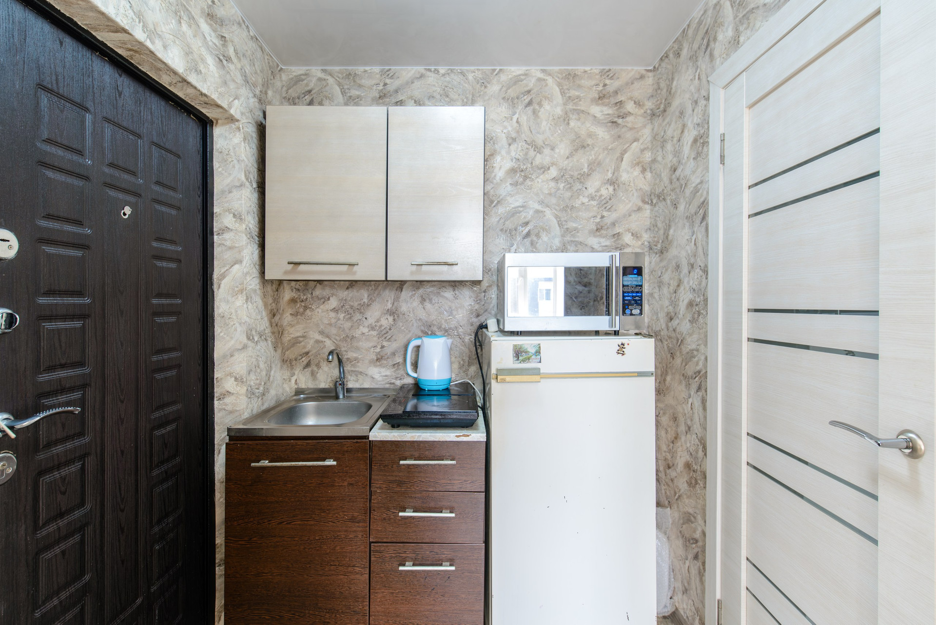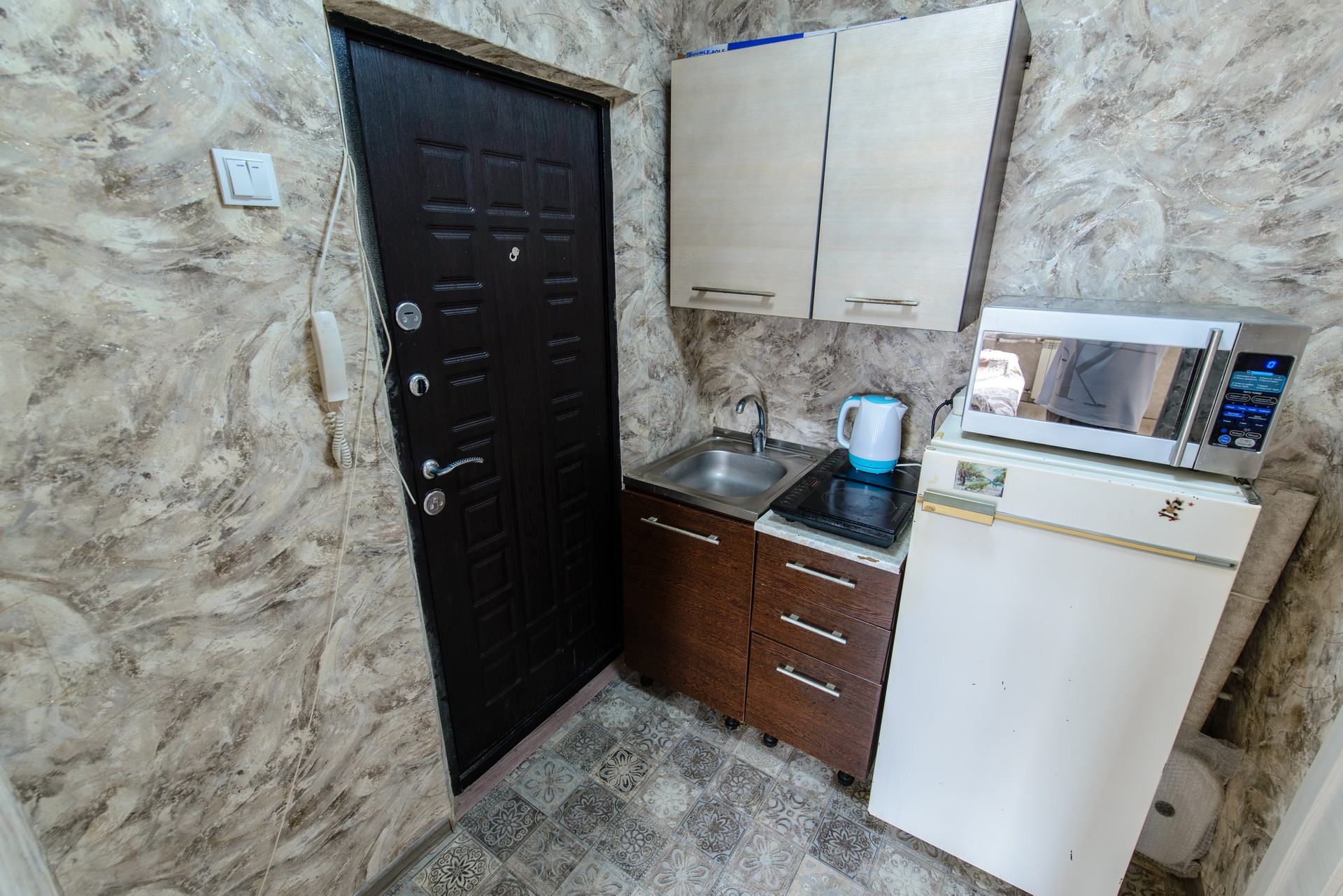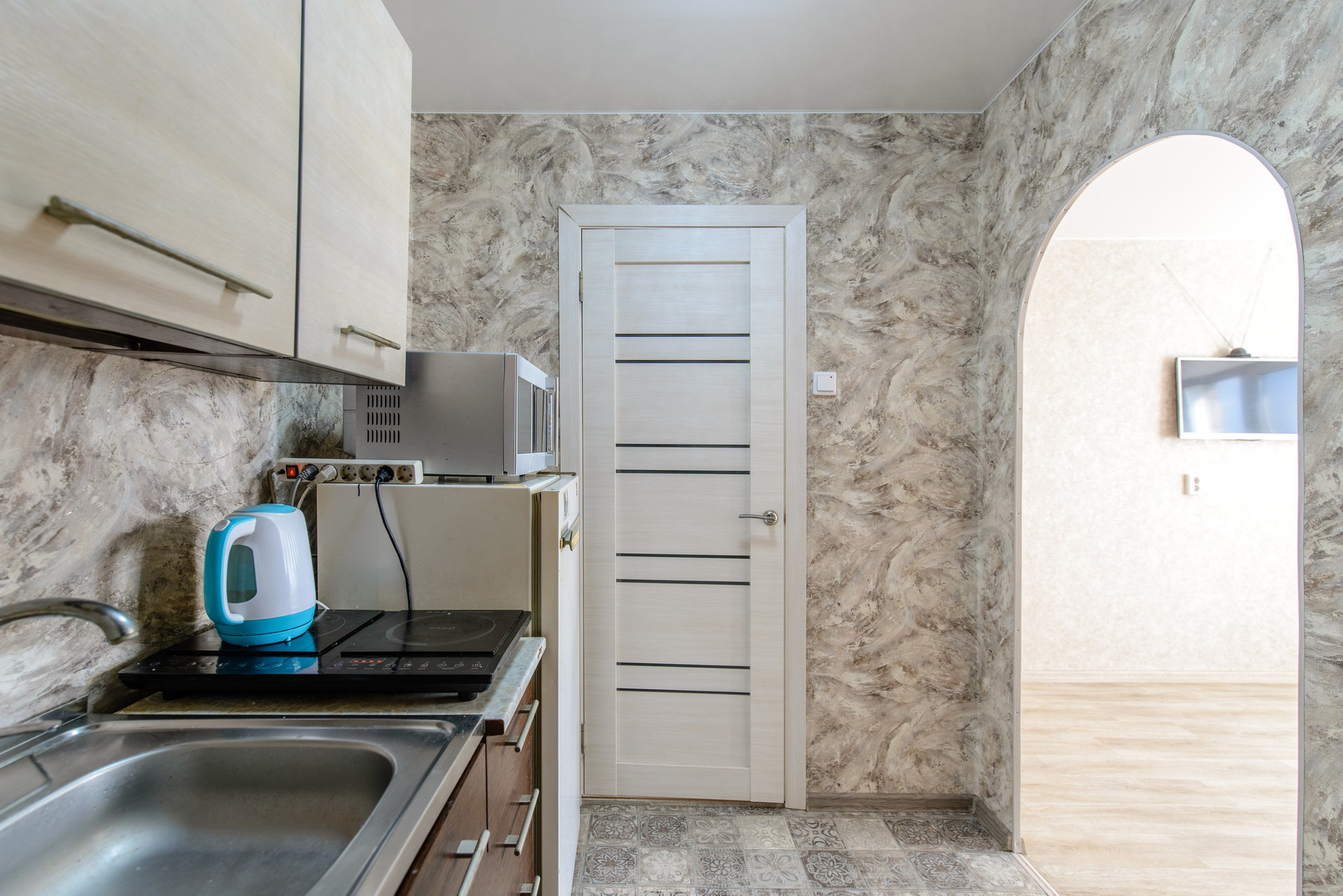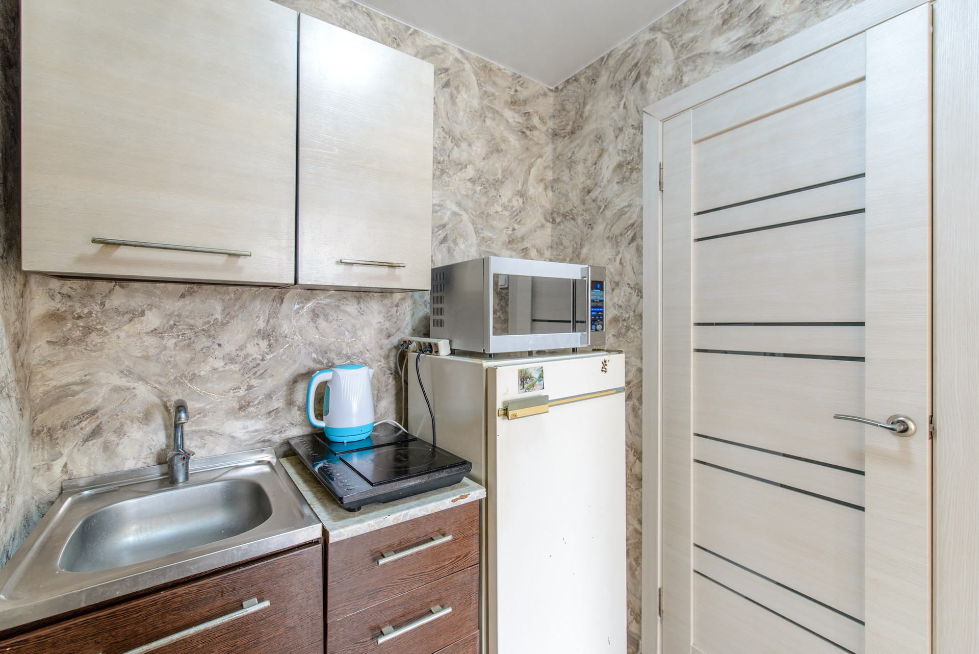 - *Техника*: Оснащена бытовой техникой, включая холодильник, электрическую плиту и стиральную машинку, что делает её удобной для приготовления пищи и хранения продуктов.