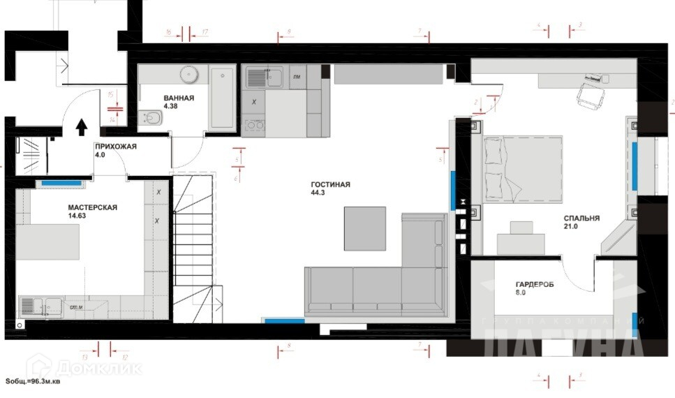 Кухня-студия(гостиная): 44,3 м²