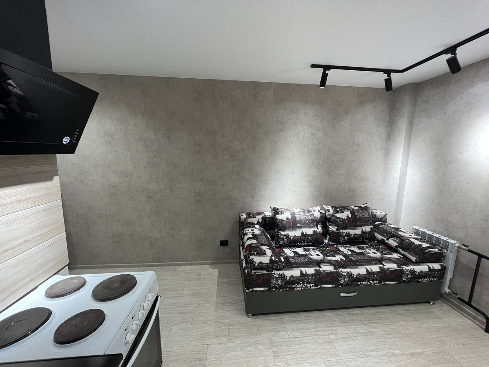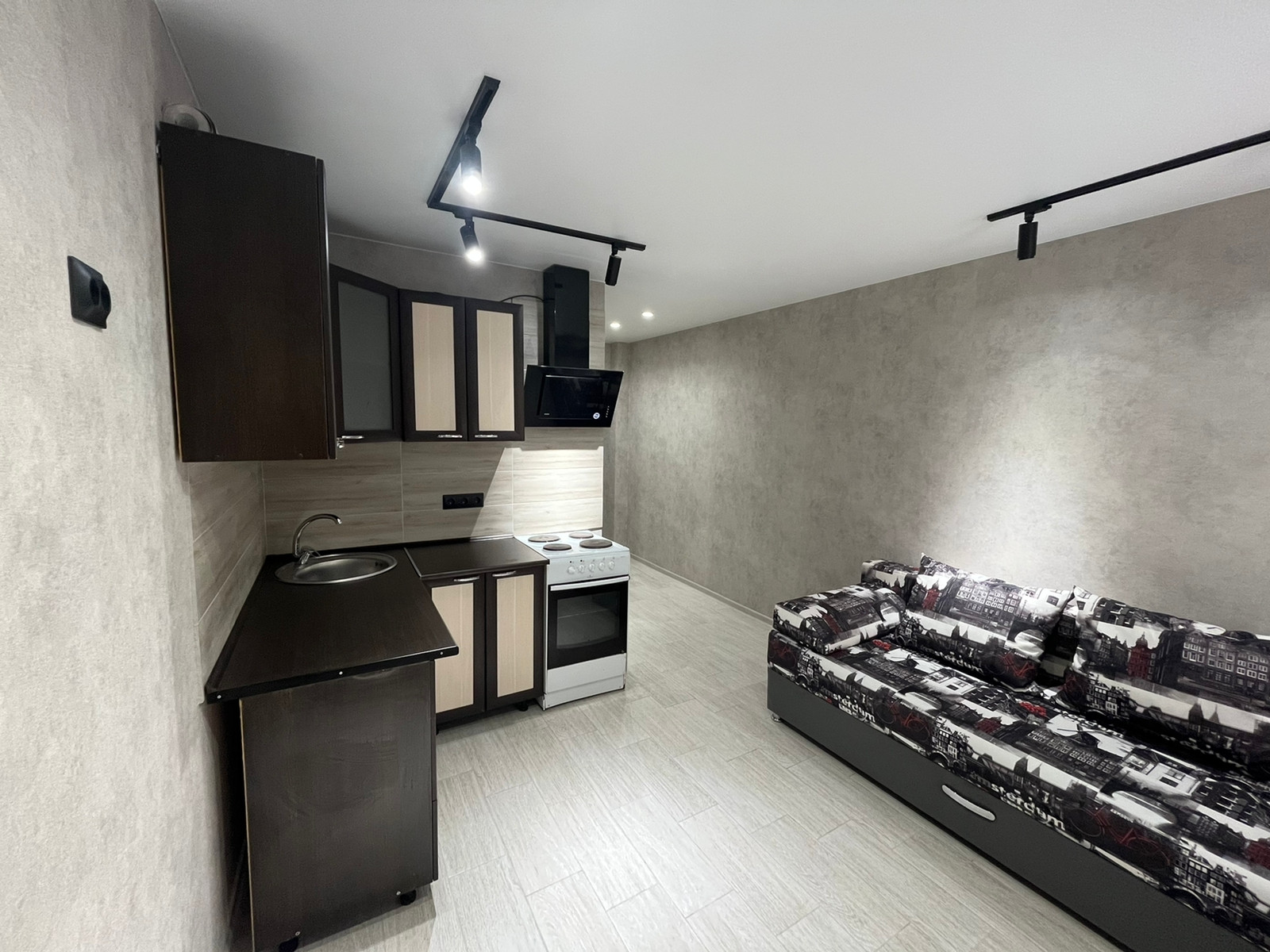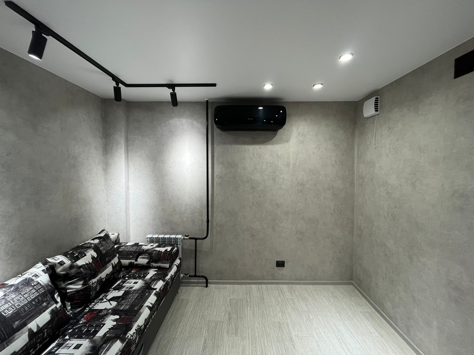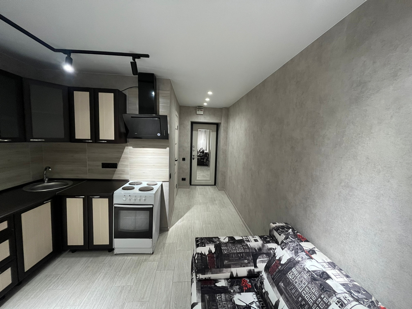 Собственник. Люкс апартаменты в стиле лофт в центре города. Без окна (не было в проекте дома, так как за окном арка). Только наличный расчёт.  Выполнен капитальный дизайнерский ремонт из качественных материалов. Вся электрика заменена, проводка (медь) в штробе. На полу керамогранит kerama marazzi. Натяжные потолки с точечными светильниками, трековым освещением. Освещение поделено на зоны с отдельными выключателями. Новые качественные входная и межкомнатные двери. Керамический фартук. Новые трубы отопления и радиатор. Новые счётчики электроэнергии и водоснабжения. Установлен кухонный гарнитур с подсветкой, новый смеситель, новая вытяжка. Временная плита (не подходит по дизайну). Диван. В санузле керамическая плитка piastrella gracia, новая сантехника, зеркало с подсветкой, б/у стиральная машина. Новый дорогой кондиционер Hisense AS-07HW4SYDTG035В серии CRYSTAL BLACK CLASSIC A (охлаждение, обогрев, турбо, ночной, вентиляция, осушение) с дисплеем, управление со смартфона или пульта д/у, индикация работы. С помощью технологии алмазного бурения в стене пробурено отверстие диаметром 110мм и установлен клапан приточной вентиляции. Отсутствие окна полностью компенсируется наличием кондиционера и приточно-вытяжной вентиляцией.