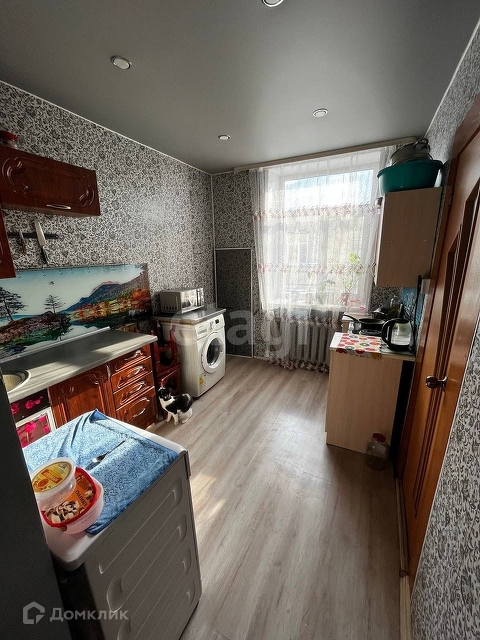 Комната площадью 12 кв. м. Плюс свой санузел с душем. Кухня общая, на выходе из комнаты, кухня делится на троих хозяев. При продаже остается гарнитур темно коричневого цвета и стиральная машина.