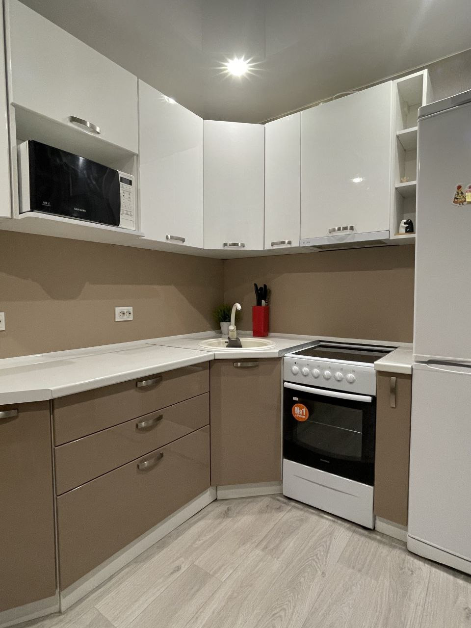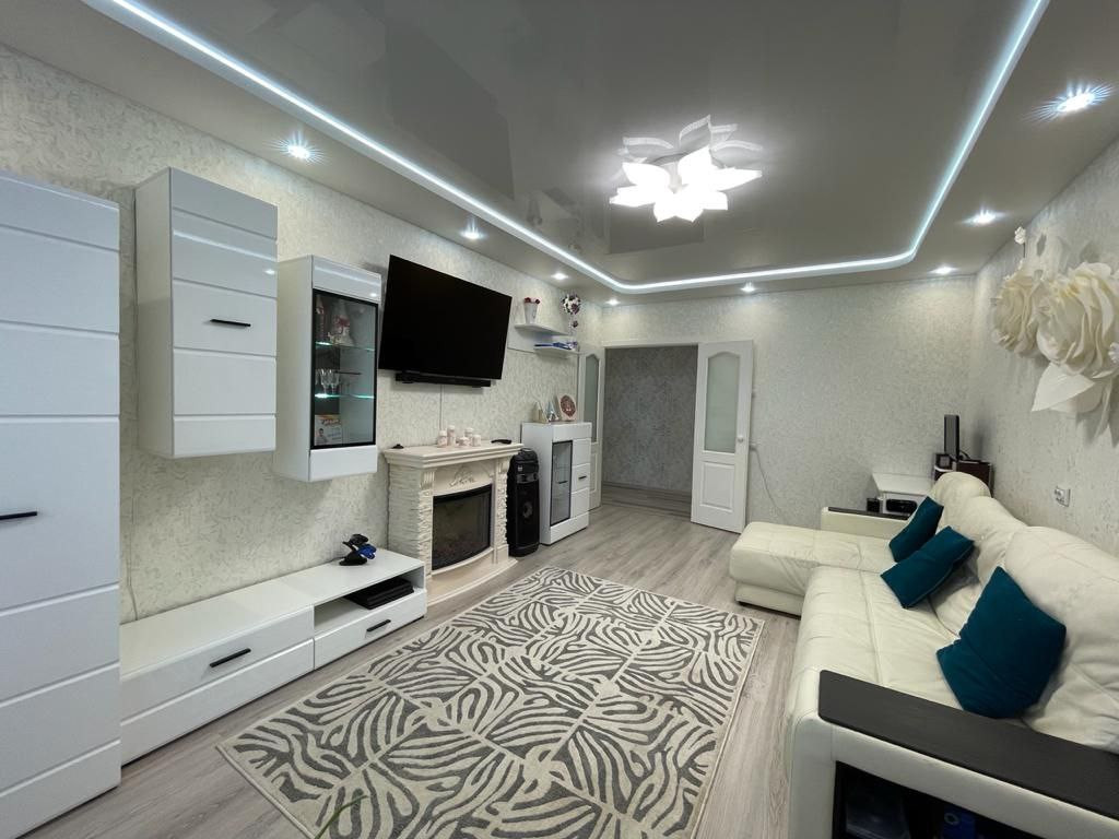 В продаже 1-комнатная квартира. На стенах обои, на полу линолеум на кухне, в комнате ламинат, натяжной потолок со сценариями освещения.