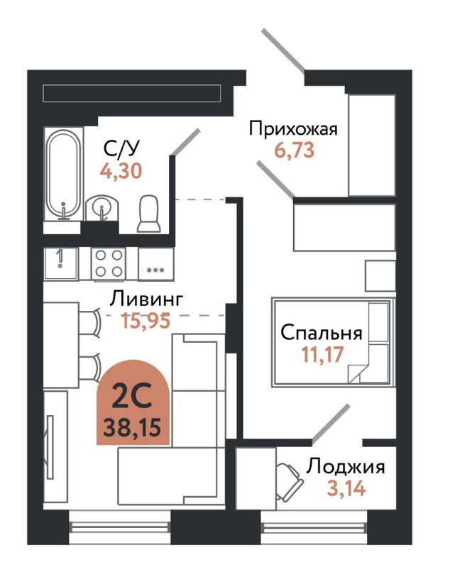 Общая площадь 38.15 м2