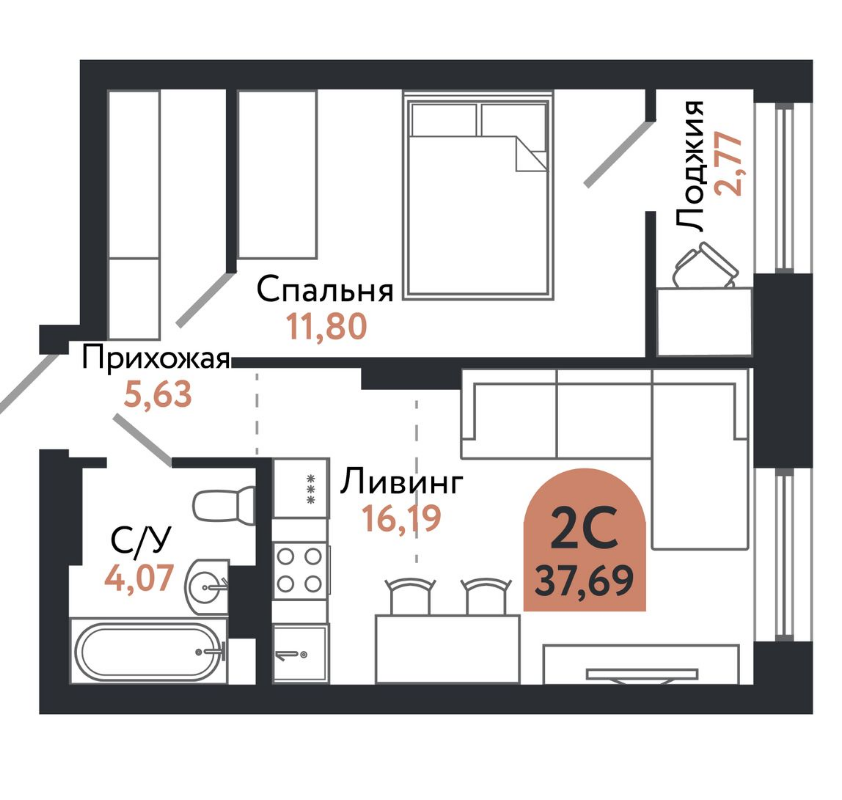 Общая площадь 37.3 м2