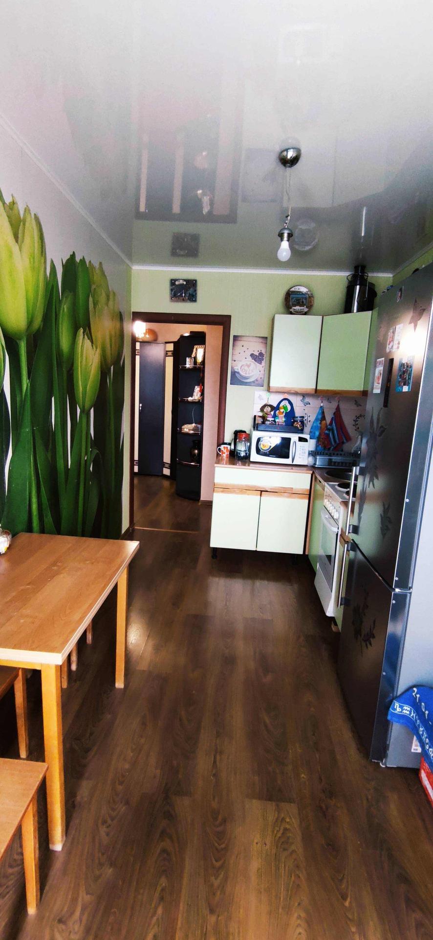 В квартире остается вся мебель, плита, стиральная машина, некоторая техника. Установлена надежная металлическая дверь. Все потолки натяжные. На полу в кухне и прихожей - ламинат, в комнате - ковролин. Большая приквартирная площадка с металлической дверью. Еще одной уникальной особенностью данной однокомнатной квартиры является наличие двух просторных лоджий с прекрасным видом. Чистый подъезд, установлены видеокамеры. Во дворе детская и спортивная площадки.