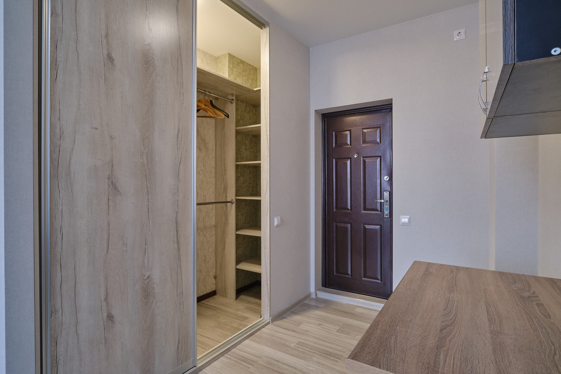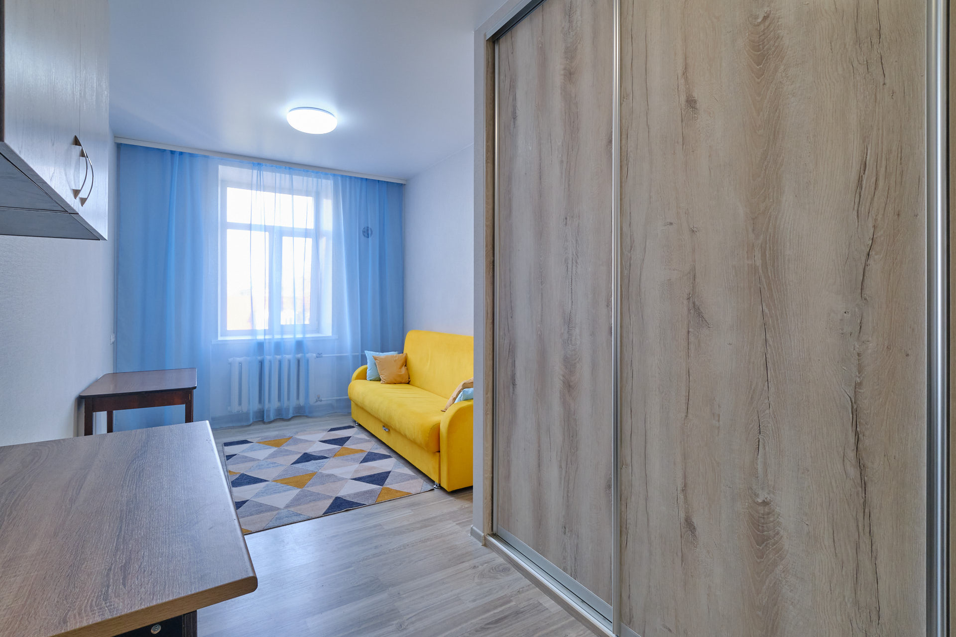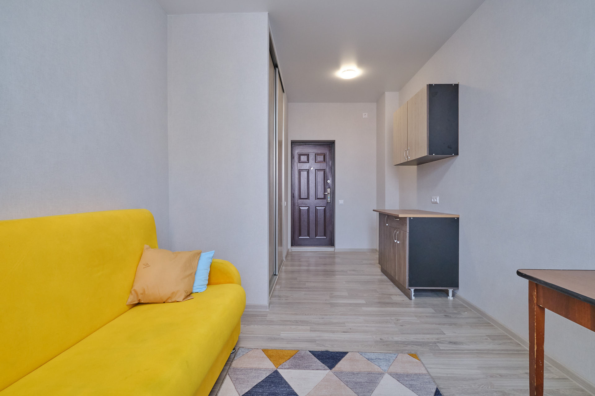 В квартире остаётся вся необходимая мебель, включая кухонный гарнитур, обеденный стол, диван, шкаф-купе для хранения одежды.